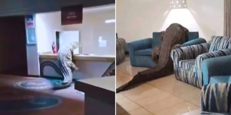 ಹರಾರೆ: ವಿಶ್ವಪ್ರಸಿದ್ಧ ವಿಕ್ಟೋರಿಯಾ ಫಾಲ್ಸ್ ಸಮೀಪವಿರುವ ಜಿಂಬಾಬ್ವೆಯ ಐಷಾರಾಮಿ ಹೋಟೆಲ್‌ವೊಂದರಲ್ಲಿ ಬೆಚ್ಚಿಬೀಳಿಸುವ ಘಟನೆಯೊಂದು ನಡೆದಿದೆ. ಬೆಳ್ಳಂಬೆಳಿಗ್ಗೆ ಹೋಟೆಲ್ ಆವರಣಕ್ಕೆ ನುಗ್ಗಿದ ಬರೋಬ್ಬರಿ 12 ಅಡಿ ಉದ್ದದ ಬೃಹತ್ ನೈಲ್ ಮೊಸಳೆಯೊಂದು, ಹೋಟೆಲ್‌ನ ರಿಸೆಪ್ಷನ್ ಮತ್ತು ಅಡುಗೆ ಕೋಣೆಯಲ್ಲಿ ಅಡ್ಡಾಡುವ ಮೂಲಕ ಸಿಬ್ಬಂದಿ ಹಾಗೂ ಪ್ರವಾಸಿಗರಲ್ಲಿ ಆತಂಕ ಮೂಡಿಸಿದೆ. ಈ ದೃಶ್ಯಗಳೀಗ ಸಾಮಾಜಿಕ ಜಾಲತಾಣಗಳಲ್ಲಿ ಭಾರಿ ವೈರಲ್ ಆಗಿವೆ.