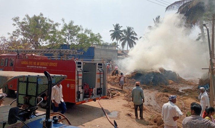 ಉಮೇಶ್ ಎಂಬುವರಿಗೆ ಸೇರಿದ ಹುಲ್ಲಿನ ಬಣವೆಗೆ ಆಕಸ್ಮಿಕವಾಗಿ ಬೆಂಕಿ ಹೊತ್ತಿಕೊಂಡಿದ್ದು, ಗ್ರಾಮಸ್ಥರು ಬೆಂಕಿ ನಂದಿಸಲು ಯತ್ನಿಸಿದ್ದಾರೆ. ಆದರೆ ಬೆಂಕಿ ನಿಯಂತ್ರಣಕ್ಕೆ ಬಾರದ ಹಿನ್ನೆಲೆಯಲ್ಲಿ ಅಗ್ನಿಶಾಮಕ ದಳಕ್ಕೆ ಮಾಹಿತಿ ನೀಡಲಾಯಿತು.