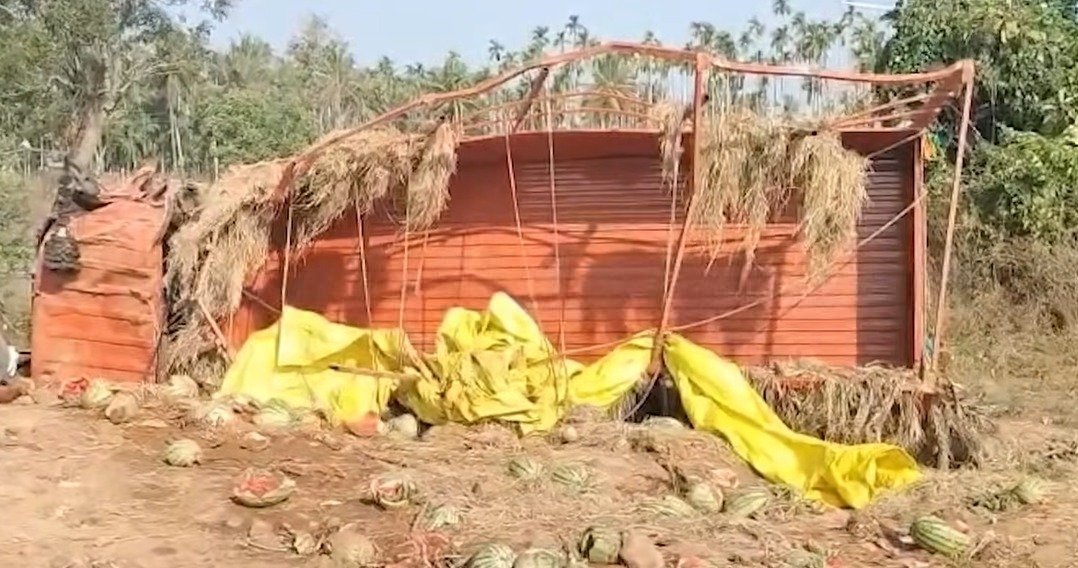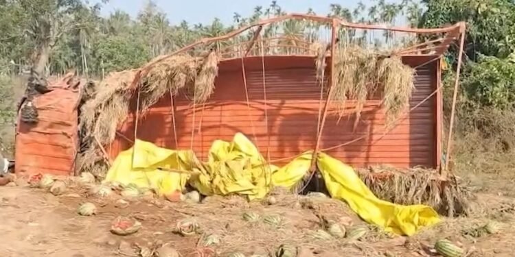 ಕಲ್ಲಂಗಡಿ ಸಾಗಿಸುತ್ತಿದ್ದ ಕ್ಯಾಂಟರ್ ಪಲ್ಟಿ.. ಹಣ್ಣುಗಳನ್ನು ಹೊತ್ತೊಯ್ದ ಜನ!