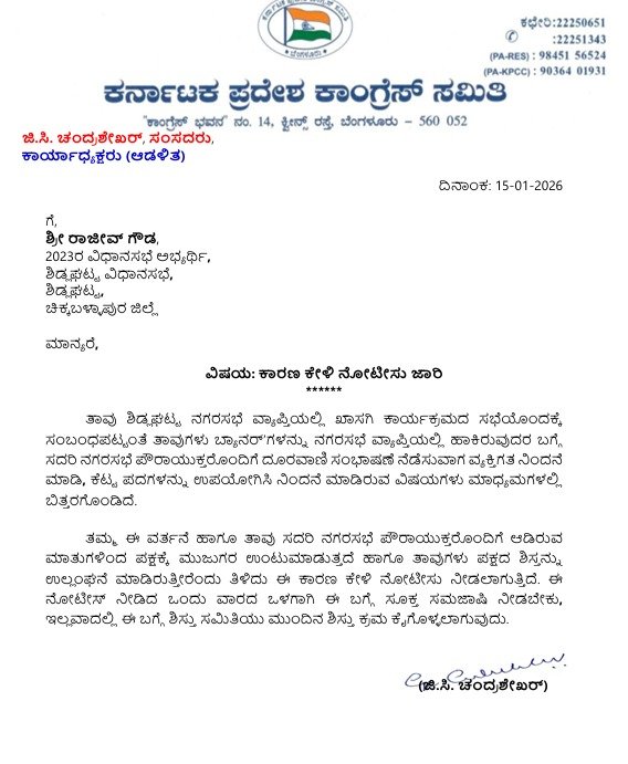 ತಮ್ಮ ಈ ವರ್ತನೆ ಹಾಗೂ ತಾವು ಸದರಿ ನಗರಸಭೆ ಪೌರಾಯುಕ್ತರೊಂದಿಗೆ ಆಡಿರುವ ಮಾತುಗಳಿಂದ ಪಕ್ಷಕ್ಕೆ ಮುಜುಗರ ಉಂಟುಮಾಡುತ್ತದೆ ಹಾಗೂ ತಾವುಗಳು ಪಕ್ಷದ ಶಿಸ್ತನ್ನು ಉಲ್ಲಂಘನೆ ಮಾಡಿರುತ್ತೀರೆಂದು ತಿಳಿದು ಈ ಕಾರಣ ಕೇಳಿ ನೋಟೀಸು ನೀಡಲಾಗುತ್ತಿದೆ. ಈ ನೋಟೀಸ್ ನೀಡಿದ ಒಂದು ವಾರದ ಒಳಗಾಗಿ ಈ ಬಗ್ಗೆ ಸೂಕ್ತ ಸಮಜಾಷಿ ನೀಡಬೇಕು, ಇಲ್ಲವಾದಲ್ಲಿ ಈ ಬಗ್ಗೆ ಶಿಸ್ತು ಸಮಿತಿಯು ಮುಂದಿನ ಶಿಸ್ತು ಕ್ರಮ ಕೈಗೊಳ್ಳಲಾಗುವುದು ಎಂದು ಕೆಪಿಸಿಸಿ ತಿಳಿಸಿದೆ.