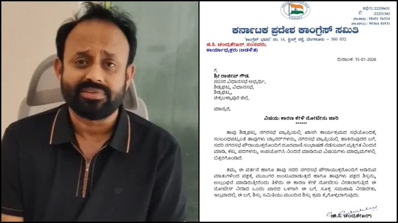 ಕೆಪಿಸಿಸಿ ಕಾರ್ಯಾಧ್ಯಕ್ಷ ಜಿಸಿ ಚಂದ್ರಶೇಖರ್ ಅವರು ನೋಟಿಸ್ ನೀಡಿದ್ದು, ಘಟನೆಯ ಕುರಿತಾಗಿ ಸ್ಪಷ್ಟನೆ ನೀಡುವಂತೆ ನೋಟಿಸ್ನಲ್ಲಿ ಉಲ್ಲೇಖಿಸಿದ್ದಾರೆ. ರಾಜೀವ್ ಗೌಡ ಅವರು 2023ರ ವಿಧಾಸಭೆ ಚುನಾವಣೆಯಲ್ಲಿ ಕಾಂಗ್ರೆಸ್ ಅಭ್ಯರ್ಥಿಯಾಗಿದ್ದರು. ಚಿಕ್ಕಬಳ್ಳಾಪುರ ಜಿಲ್ಲೆಯ ಶಿಡ್ಲಘಟ್ಟ ಕ್ಷೇತ್ರದಿಂದ ಸ್ಪರ್ಧಿಸಿದ್ದರು. ಇತ್ತೀಚೆಗೆ ಬ್ಯಾನರ್ ವಿಚಾರವಾಗಿ ನಗರಸಭೆ ಪೌರಾಯುಕ್ತೆ ಅಮೃತಾ ಗೌಡ ಅವರ ಜೊತೆ ಫೋನ್ನಲ್ಲಿ ಮಾತನಾಡುವ ಸಂದರ್ಭದಲ್ಲಿ ಅವಾಚ್ಯ ಶಬ್ದಗಳಿಂದ ನಿಂದಿಸಿ ಬೆದರಿಕೆ ಹಾಕಿದ್ದು, ಭಾರೀ ವಿವಾದಕ್ಕೆ ಕಾರಣವಾಗಿದೆ.
