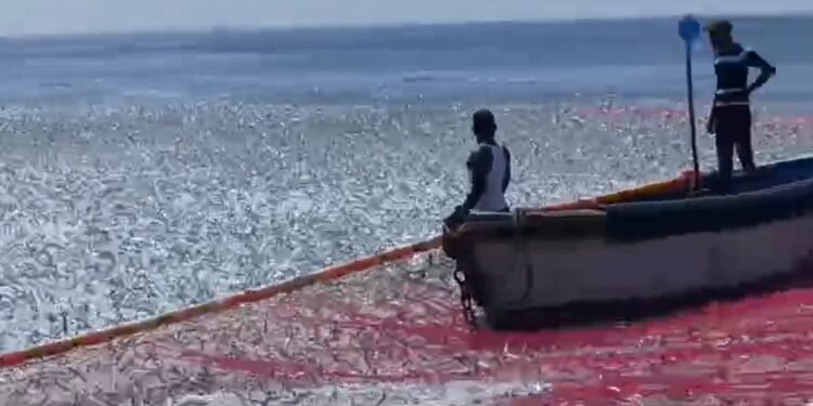 ಕಾರವಾರ : ಸಮುದ್ರ ತೀರ ಭಾಗಕ್ಕೆ ಲಕ್ಷಾಂತರ ಮೀನುಗಳು ಬಂದಿದ್ದು, ಮೀನುಗಾರರಿಗೆ ಭರ್ಜರಿ ಬೇಟೆ ಸಿಕ್ಕಿದೆ. ಹಲವು ತಿಂಗಳ ಹವಾಮಾನ ಬದಲಾವಣೆಯಿಂದ ಸಂಪೂರ್ಣ ನೆಲ ಕಚ್ಚಿದ್ದ ಮೀನುಗಾರಿಕೆ ಇನ್ನೇನು ಮತ್ತೆ ಪ್ರಾರಂಭವಾಗುತ್ತಿರುವ ಬೆನ್ನಲ್ಲೇ ಅರಬ್ಬಿ ಸಮುದ್ರದಲ್ಲಿ ಮೀನುಗಾರರಿಗೆ ಭರ್ಜರಿ ಮತ್ಸ್ಯ ಬೇಟೆಯಾಗುತ್ತಿದೆ.