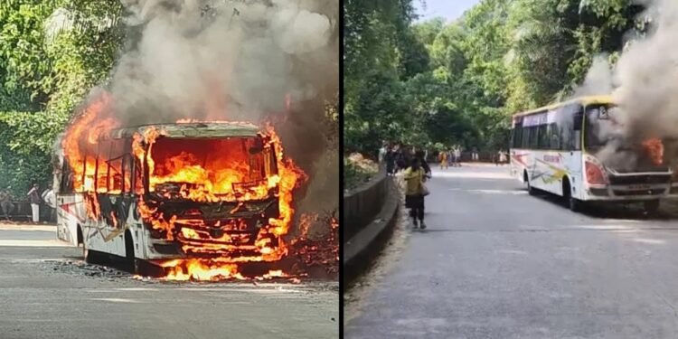 ಮಾಹಿತಿಯ ಪ್ರಕಾರ, ಚಲಿಸುತ್ತಿದ್ದ ಬಸ್ನ ಇಂಜಿನ್ನಲ್ಲಿ ಶಾರ್ಟ್ ಸರ್ಕ್ಯೂಟ್ನಿಂದ ಬೆಂಕಿ ಕಾಣಿಸಿಕೊಂಡಿದೆ. ಕ್ಷಣಾರ್ಧದಲ್ಲಿ ಬೆಂಕಿ ಇಡೀ ಬಸ್ಸಿಗೆ ವ್ಯಾಪಿಸಿದ್ದು, ನೋಡನೋಡುತ್ತಿದ್ದಂತೆಯೇ ಬಸ್ ಬೆಂಕಿಯ ಹತ್ತಿಕೊಂಡಿದೆ. ಘಟನೆ ನಡೆದ ವೇಳೆ ಬಸ್ಸಿನಲ್ಲಿ ಸುಮಾರು 20ಕ್ಕೂ ಹೆಚ್ಚು ಪ್ರಯಾಣಿಕರು ಇದ್ದರು ಎನ್ನಲಾಗಿದೆ.