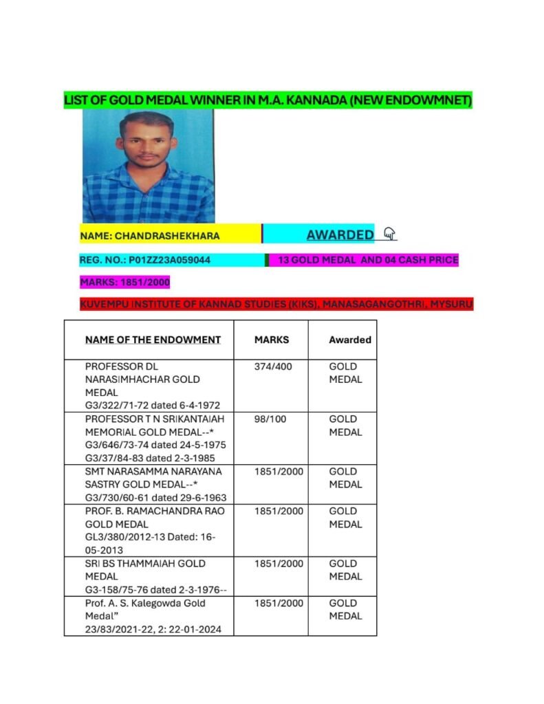 ಮೈಸೂರು ವಿಶ್ವವಿದ್ಯಾಲಯದ ಕನ್ನಡ ಅಧ್ಯಯನ ಸಂಸ್ಥೆ (KIKS) ವಿದ್ಯಾರ್ಥಿಯ ಇಡೀ ರಾಜ್ಯಕ್ಕೆ ಮಾದರಿಯಾಗಿದ್ದು, ಕನ್ನಡ ವಿಷಯದಲ್ಲಿ ಈ ಮಟ್ಟದ ಪ್ರಶಸ್ತಿ ಗಳಿಸಿ ಯುವ ಪೀಳಿಗೆಗೆ ಪ್ರೇರಣೆಯಾದ ವಿದ್ಯಾರ್ಥಿ ಚಂದ್ರಶೇಖರ ಸಾಧನೆಗೆ ಸೋಷಿಯಲ್ ಮಿಡಿಯಾದಲ್ಲಿ ಪ್ರಶಂಸೆಯ ಸುರಿಮಳೆಯೆ ಹರಿದು ಬಂದಿದೆ.