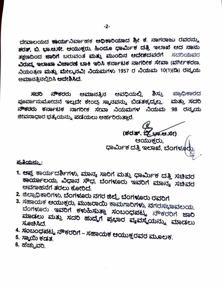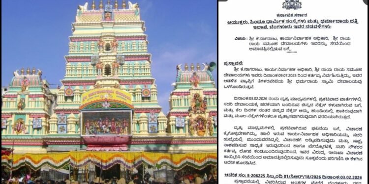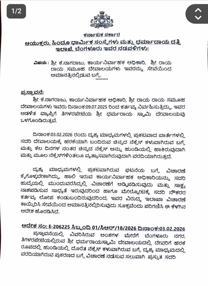 ಬೆಂಗಳೂರು | ಬೆಂಗಳೂರಿನ ಇತಿಹಾಸ ಪ್ರಸಿದ್ಧ ಧರ್ಮರಾಯಸ್ವಾಮಿ ದೇವಸ್ಥಾನದಲ್ಲಿದ್ದ ಚಿನ್ನಾಭಾರಣ ಕಳ್ಳತನ ಆರೋಪ ಪ್ರಕರಣ ಸಂಬಂಧ ಮುಜರಾಯಿ ಇಲಾಖೆಯ EO ನಾಗರಾಜ್‌ರನ್ನು ಅಮಾನತು ಮಾಡಿ ಮುಜರಾಯಿ ಸಚಿವ ರಾಮಲಿಂಗಾರೆಡ್ಡಿ ಆದೇಶ ಹೊರಡಿಸಿದ್ದಾರೆ.