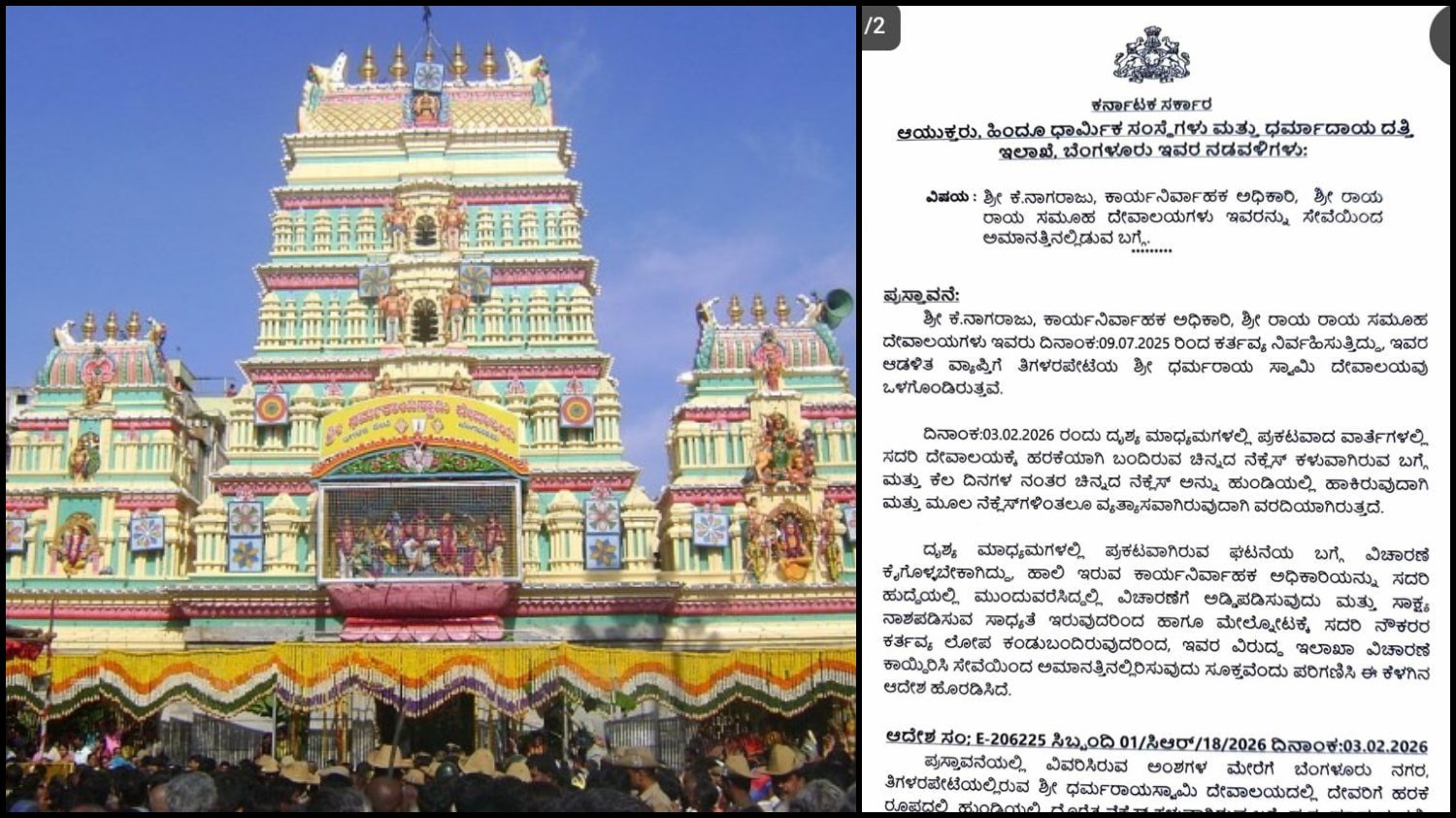 ಧರ್ಮರಾಯಸ್ವಾಮಿ ದೇಗುಲದ ಆಭರಣ ಕದ್ದ ಆರೋಪ | ಮುಜರಾಯಿ ಇಲಾಖೆ EO ನಾಗರಾಜ್ ಅಮಾನತು!