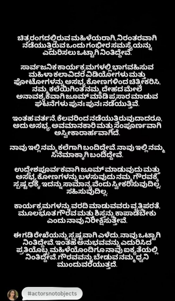 ನಟಿ ಸಪ್ತಮಿ ಗೌಡ, ತಮ್ಮ ಇನ್’ಸ್ಟಾಗ್ರಾಂನಲ್ಲಿ ಕನ್ನಡ ಮತ್ತು ಇಂಗ್ಲಿಷ್‌ನಲ್ಲಿ ಪೋಸ್ಟ್ ಮಾಡಿದ್ದು, ಪೋಸ್ಟ್ ವಿವರ ಹೀಗಿದೆ.. “ಚಿತ್ರರಂಗದಲ್ಲಿರುವ ಮಹಿಳೆಯರಾಗಿ ನಿರಂತರವಾಗಿ ನಡೆಯುತ್ತಿರುವ ಒಂದು ಗಂಭೀರ ಸಮಸ್ಯೆಯನ್ನು ಎದುರಿಸಲು ಒಟ್ಟಾಗಿ ನಿಂತಿದ್ದೇವೆ. ಸಾರ್ವಜನಿಕ ಕಾರ್ಯಕ್ರಮಗಳಲ್ಲಿ ಭಾಗವಹಿಸುವ ಮಹಿಳಾ ಕಲಾವಿದರ ವಿಡಿಯೋಗಳು ಮತ್ತು ಫೋಟೋಗಳನ್ನು ಅಸಭ್ಯ ಕೋನಗಳಿಂದ ಚಿತ್ರಿಕರಿಸಿ, ನಮ್ಮ ಕಲೆಗಿಂತ ನಮ್ಮ ದೇಹದ ಮೇಲೆ ಅನಾವಶ್ಯಕವಾಗಿ ಜೂಮ್ ಮಾಡಿ ಪ್ರಸಾರ ಮಾಡುವ ಘಟನೆಗಳು ಪುನಃ ಪುನಃ ನಡೆಯುತ್ತಿವೆ. ಇಂತಹ ವರ್ತನೆ ಕೆಲವರಿಂದ ನಡೆಯುತ್ತಿರುವುದಾದರೂ ಅದು ಅಸಭ್ಯ, ಅವಮಾನಕಾರಿ ಮತ್ತು ಸಂಪೂರ್ಣವಾಗಿ ಅಸ್ವೀಕಾರಾರ್ಹವಾಗಿದೆ. ನಾವು ಇಲ್ಲಿ ನಮ್ಮ ಕಲೆಗಾಗಿ ಬಂದಿದ್ದೇವೆ ನಾವು ಇಲ್ಲಿ ನಮ್ಮ ಸಿನಿಮಾ ಸಿನಿಮಾಕ್ಕಾಗಿ ಬಂದಿದ್ದೇವೆ. ಉದ್ದೇಶಪೂರ್ವಕವಾಗಿ ಜೂಮ್ ಮಾಡುವುದು ಮತ್ತು ಅಸಭ್ಯ ಕೋನಗಳಿಂದ ಚಿತ್ರೀಕರಿಸುವುದು, ನಮ್ಮ ಗೌರವಕ್ಕೆ ಸ್ಪಷ್ಟ ಧಕ್ಕೆ. ಇದನ್ನು ಸಾಮಾನ್ಯವೆಂದು ಸ್ವೀಕರಿಸುವುದಿಲ್ಲ, ಸಹಿಸುವುದಿಲ್ಲ. ಕಾರ್ಯಕ್ರಮಗಳನ್ನು ವರದಿ ಮಾಡುವವರು ವೃತ್ತಿಪರತೆ ಮೂಲಭೂತ ಗೌರವ ಮತ್ತು ಶಿಸ್ತನ್ನು ಕಾಪಾಡಬೇಕು ಎಂದು ನಾವು ನಿರೀಕ್ಷಿಸುತ್ತೇವೆ . ಈ ಗಡಿರೇಖೆಯನ್ನು ಸ್ಪಷ್ಟವಾಗಿ ಎಳೆದು, ನಾವು ಒಟ್ಟಾಗಿ ನಿಂತಿದ್ದೇವೆ. ಇಂತಹ ಅನುಭವವನ್ನು ಎದುರಿಸಿದ ಪ್ರತಿಯೊಬ್ಬ ಮಹಿಳೆಯೊಂದಿಗೂ ನಾವು ಐಕ್ಯತೆಯಲ್ಲಿ ನಿಂತಿದ್ದೇವೆ. ಗೌರವವನ್ನು ಬೇಡುವ ನಮ್ಮ ಧ್ವನಿ ಮುಂದುವರಿಯುತ್ತದೆ ಎಂದು ಸಪ್ತಮಿ ಗೌಡ ಪೋಸ್ಟ್ ಮಾಡಿದ್ದಾರೆ.