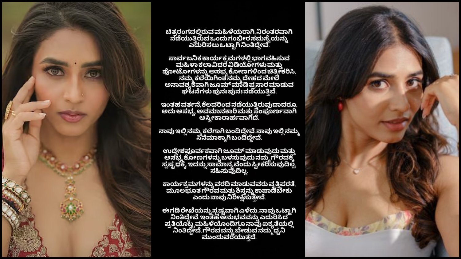 ನಟಿ ಸಪ್ತಮಿ ಗೌಡ, ತಮ್ಮ ಇನ್’ಸ್ಟಾಗ್ರಾಂನಲ್ಲಿ ಕನ್ನಡ ಮತ್ತು ಇಂಗ್ಲಿಷ್‌ನಲ್ಲಿ ಪೋಸ್ಟ್ ಮಾಡಿದ್ದು, ಪೋಸ್ಟ್ ವಿವರ ಹೀಗಿದೆ.. “ಚಿತ್ರರಂಗದಲ್ಲಿರುವ ಮಹಿಳೆಯರಾಗಿ ನಿರಂತರವಾಗಿ ನಡೆಯುತ್ತಿರುವ ಒಂದು ಗಂಭೀರ ಸಮಸ್ಯೆಯನ್ನು ಎದುರಿಸಲು ಒಟ್ಟಾಗಿ ನಿಂತಿದ್ದೇವೆ. ಸಾರ್ವಜನಿಕ ಕಾರ್ಯಕ್ರಮಗಳಲ್ಲಿ ಭಾಗವಹಿಸುವ ಮಹಿಳಾ ಕಲಾವಿದರ ವಿಡಿಯೋಗಳು ಮತ್ತು ಫೋಟೋಗಳನ್ನು ಅಸಭ್ಯ ಕೋನಗಳಿಂದ ಚಿತ್ರಿಕರಿಸಿ, ನಮ್ಮ ಕಲೆಗಿಂತ ನಮ್ಮ ದೇಹದ ಮೇಲೆ ಅನಾವಶ್ಯಕವಾಗಿ ಜೂಮ್ ಮಾಡಿ ಪ್ರಸಾರ ಮಾಡುವ ಘಟನೆಗಳು ಪುನಃ ಪುನಃ ನಡೆಯುತ್ತಿವೆ. ಇಂತಹ ವರ್ತನೆ ಕೆಲವರಿಂದ ನಡೆಯುತ್ತಿರುವುದಾದರೂ ಅದು ಅಸಭ್ಯ, ಅವಮಾನಕಾರಿ ಮತ್ತು ಸಂಪೂರ್ಣವಾಗಿ ಅಸ್ವೀಕಾರಾರ್ಹವಾಗಿದೆ. ನಾವು ಇಲ್ಲಿ ನಮ್ಮ ಕಲೆಗಾಗಿ ಬಂದಿದ್ದೇವೆ ನಾವು ಇಲ್ಲಿ ನಮ್ಮ ಸಿನಿಮಾ ಸಿನಿಮಾಕ್ಕಾಗಿ ಬಂದಿದ್ದೇವೆ. ಉದ್ದೇಶಪೂರ್ವಕವಾಗಿ ಜೂಮ್ ಮಾಡುವುದು ಮತ್ತು ಅಸಭ್ಯ ಕೋನಗಳಿಂದ ಚಿತ್ರೀಕರಿಸುವುದು, ನಮ್ಮ ಗೌರವಕ್ಕೆ ಸ್ಪಷ್ಟ ಧಕ್ಕೆ. ಇದನ್ನು ಸಾಮಾನ್ಯವೆಂದು ಸ್ವೀಕರಿಸುವುದಿಲ್ಲ, ಸಹಿಸುವುದಿಲ್ಲ. ಕಾರ್ಯಕ್ರಮಗಳನ್ನು ವರದಿ ಮಾಡುವವರು ವೃತ್ತಿಪರತೆ ಮೂಲಭೂತ ಗೌರವ ಮತ್ತು ಶಿಸ್ತನ್ನು ಕಾಪಾಡಬೇಕು ಎಂದು ನಾವು ನಿರೀಕ್ಷಿಸುತ್ತೇವೆ . ಈ ಗಡಿರೇಖೆಯನ್ನು ಸ್ಪಷ್ಟವಾಗಿ ಎಳೆದು, ನಾವು ಒಟ್ಟಾಗಿ ನಿಂತಿದ್ದೇವೆ. ಇಂತಹ ಅನುಭವವನ್ನು ಎದುರಿಸಿದ ಪ್ರತಿಯೊಬ್ಬ ಮಹಿಳೆಯೊಂದಿಗೂ ನಾವು ಐಕ್ಯತೆಯಲ್ಲಿ ನಿಂತಿದ್ದೇವೆ. ಗೌರವವನ್ನು ಬೇಡುವ ನಮ್ಮ ಧ್ವನಿ ಮುಂದುವರಿಯುತ್ತದೆ ಎಂದು ಸಪ್ತಮಿ ಗೌಡ ಪೋಸ್ಟ್ ಮಾಡಿದ್ದಾರೆ.