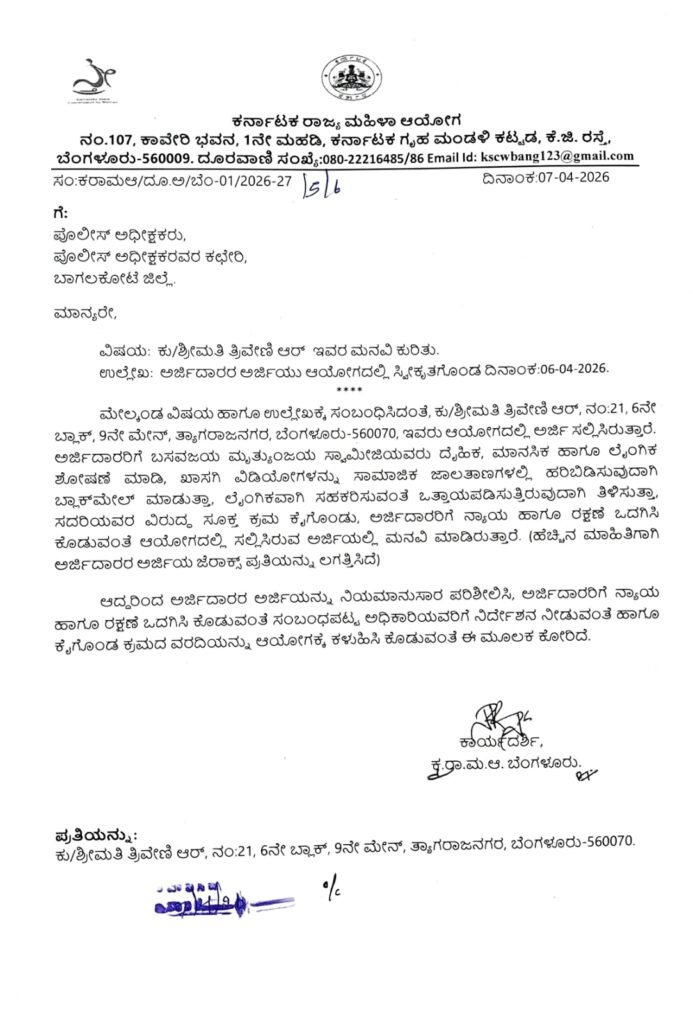 ಸ್ವಾಮೀಜಿ ತನ್ನ ವಿಡಿಯೋ ಮಾಡಿಕೊಂಡು ಬೆದರಿಕೆ ಹಾಕುತ್ತಿದ್ದಾರೆ ಎಂದು ಬೆಂಗಳೂರು ಮೂಲದ ಮಹಿಳೆ ಗಂಭೀರ ಆರೋಪ ಮಾಡಿದ್ದು, ಈ ಕುರಿತು ರಾಜ್ಯ ಮಹಿಳಾ ಆಯೋಗಕ್ಕೆ ದೂರು ದಾಖಲು ಮಾಡಿದ್ದಾರೆ. ಈ ದೂರಿನ ಬೆನ್ನಲ್ಲೇ ಎಚ್ಚೆತ್ತ ಮಹಿಳಾ ಆಯೋಗ, ಪ್ರಕರಣವನ್ನು ಗಂಭೀರವಾಗಿ ಪರಿಗಣಿಸಿ ಬಾಗಲಕೋಟೆ ಜಿಲ್ಲಾ ಪೊಲೀಸ್ ಅಧೀಕ್ಷಕರಿಗೆ ಪತ್ರ ಬರೆದಿದೆ.