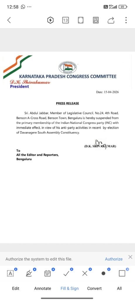 ದಾವಣಗೆರೆ ದಕ್ಷಿಣ ಕ್ಷೇತ್ರದ ಚುನಾವಣೆ ವಿಚಾರವಾಗಿ ಅಬ್ದುಲ್ ಜಬ್ಬಾರ್ ವಿರುದ್ದ ಮತ್ತಷ್ಟು ದಾಖಲೆಗಳು ಲಭ್ಯವಾದ ಹಿನ್ನೆಲೆಯಲ್ಲಿ ಅಮಾನತು ಮಾಡಲಾಗಿದೆ. ಪಕ್ಷ ವಿರೋಧಿ ಚಟುವಟಿಕೆ ನಡೆಸಿದ್ದಾರೆ ಎಂಬ ಆರೋಪದ ಹಿನ್ನೆಲೆಯಲ್ಲಿ ಈ ಕ್ರಮ ಆಗಿದೆ. ಪಕ್ಷದ ಪ್ರಾಥಮಿಕ ಸದಸ್ಯತ್ವದಿಂದಲೇ ಅಮಾನತು ಮಾಡಿ ಆದೇಶ ಹೊರಡಿಸಲಾಗಿದೆ.