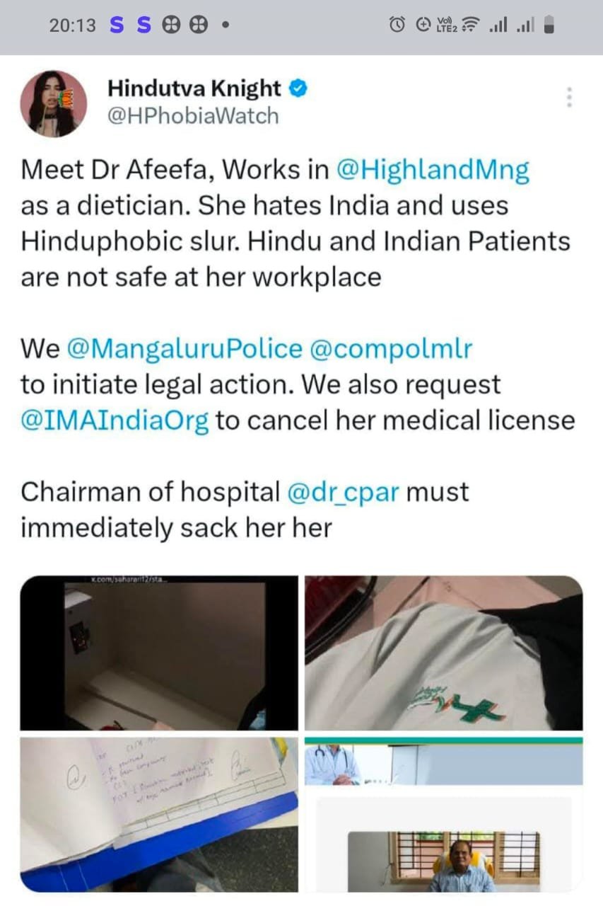 ಯುವತಿಯ ಪೋಸ್ಟ್ ಗೆ ಇದೀಗ ತೀವ್ರ ಆಕ್ರೋಶ ವ್ಯಕ್ತವಾಗಿದ್ದು, ಯುವತಿಯ ವಿರುದ್ಧ FIR ದಾಖಲಾಗಿದೆ. ಮಂಗಳೂರಿನ ಹೈಲ್ಯಾಂಡ್ ಆಸ್ಪತ್ರೆಯಲ್ಲಿ ಡೈಟೀಶನ್ ಅಫೀಫಾ ಫಾತೀಮಾ ಎಂಬ ಯುವತಿ HELP STINKY HINDUS BEHIMD ME (ಕಾಪಾಡಿ ಕೊಳಕು ಹಿಂದೂಗಳು ನನ್ನ ಹಿಂದೆ ಬಿದ್ದಿದ್ದಾರೆ) AM I INDIAN- YES, DO I HATE INDIA – YES, ( ಹೌದು ನಾನು ಭಾರತೀಯಳು, ಹೌದು ನಾನು ಭಾರತವನ್ನು ದ್ವೇಷಿಸುತ್ತೇನೆ) ಎಂದು ಸಾಮಾಜಿಕ ಜಾಲತಾಣದಲ್ಲಿ ಪೋಸ್ಟ್ ಮಾಡಿದ್ದಾಳೆ.