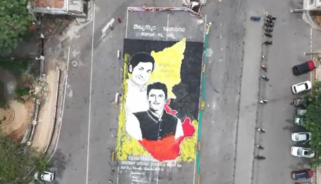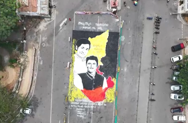 ಕೋಟೆ ಆಂಜನೇಯಸ್ವಾಮಿ ದೇವಸ್ಥಾನದ ಅವರಣದಲ್ಲಿ ರಂಗೋಲಿಯಲ್ಲಿ 8500 ಅಡಿಗಳಷ್ಟು ಬೃಹತ್ ಭಾವ ಚಿತ್ರವನ್ನು ನಿರ್ಮಾಣ ಮಾಡಿದ್ದು, ಕರ್ನಾಟಕದ ಭೂಪಟದ ಒಳಗೆ ವರನಟ ರಾಜಕುಮಾರ್ ಹಾಗೂ ಪುನೀತ್ ರಾಜಕುಮಾರ್ ಅವರ ಚಿತ್ರ ಬಿಡಿಸಿದ್ದಾರೆ.