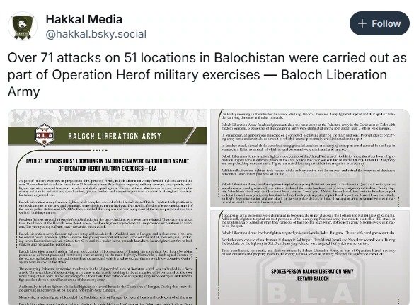 “ಪಾಕಿಸ್ತಾನದ ಸೇನಾ ನೆಲೆಗಳು ಹಾಗೂ ಗುಪ್ತಚರ ಕಚೇರಿಗಳನ್ನು ಗುರಿಯಾಗಿಸಿ ಬಿಎಲ್ಎ ಸದಸ್ಯರು ದಾಳಿ ನಡೆಸಿದ್ದಾರೆ. ಇದರ ಸಂಪೂರ್ಣ ಹೊಣೆಯನ್ನು ಬಿಎಲ್ಎ ಹೊರುತ್ತದೆ. ಬಿಎಲ್ಎ ಯಾವುದೇ ದೇಶದ ಆಣತಿಯಂತೆ ಕಾರ್ಯನಿರ್ವಹಿಸುವುದಿಲ್ಲ. ಸ್ವತಂತ್ರ ದೇಶಕ್ಕಾಗಿ ನಮ್ಮ ಹೋರಾಟ ಮುಂದುವರಿಯಲಿದೆ” ಎಂದು ಪಾಕಿಸ್ತಾನಕ್ಕೆ ಖಡಕ್ ಸಂದೇಶ ರವಾನಿಸಿದೆ. ಕೆಲ ದಿನಗಳ ಹಿಂದಷ್ಟೇ ಪಾಕಿಸ್ತಾನದ ಸೈನಿಕರ ಮೇಲೆ ಬಿಎಲ್ಎ ದಾಳಿ ನಡೆಸಿತ್ತು.