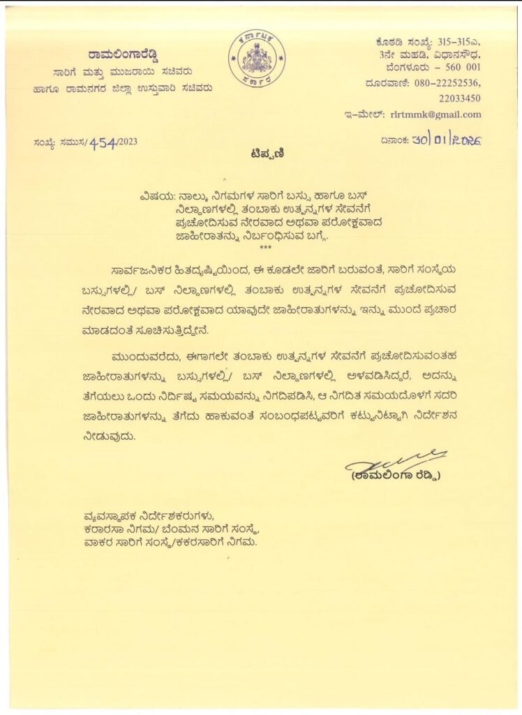 “ಸಾರ್ವಜನಿಕರ ಹಿತದೃಷ್ಟಿಯಿಂದ, ತಂಬಾಕು ಉತ್ಪನ್ನಗಳ ಸೇವನೆಯನ್ನು ನೇರವಾಗಿ ಅಥವಾ ಪರೋಕ್ಷವಾಗಿ ಉತ್ತೇಜಿಸುವ ಯಾವುದೇ ಜಾಹೀರಾತುಗಳನ್ನು ತಕ್ಷಣದಿಂದ ಜಾರಿಗೆ ಬರುವಂತೆ ಬಸ್ಸುಗಳಲ್ಲಿ ಅಥವಾ ಸಾರಿಗೆ ನಿಗಮಗಳ ಬಸ್ ನಿಲ್ದಾಣಗಳಲ್ಲಿ ಪ್ರದರ್ಶಿಸಬಾರದು ಎಂದು ನಾನು ಈ ಮೂಲಕ ನಿರ್ದೇಶಿಸುತ್ತೇನೆ” ಎಂದು ರಾಮಲಿಂಗಾ ರೆಡ್ಡಿ ಹೇಳಿದ್ದಾರೆ.