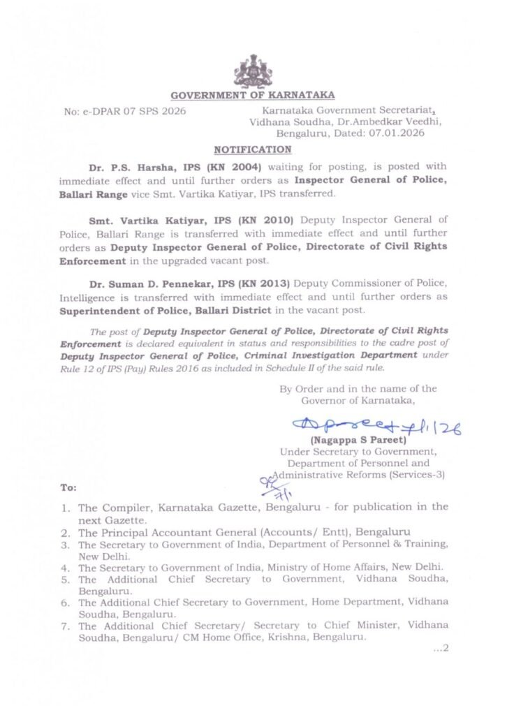 ಸಿವಿಲ್ ರೈಟ್ಸ್ ಮತ್ತು ಎನ್ಫೋರ್ಸ್​ಮೆಂಟ್​ ವಿಭಾಗಕ್ಕೆ ವರ್ತಿಕಾರನ್ನು ಟ್ರಾನ್ಸ್​​ಫರ್​​ ಮಾಡಲಾಗಿದ್ದು, ಬಳ್ಳಾರಿ ವಲಯದ ನೂತನ ಐಜಿಪಿಯಾಗಿ ಡಾ.ಪಿ.ಎಸ್.ಹರ್ಷ ಅವರನ್ನು ನೇಮಕ ಮಾಡಲಾಗಿದೆ. ಪವನ್ ನೆಜ್ಜೂರು ಅವರ ಅಮಾನತಿನಿಂದ ತೆರವಾಗಿದ್ದ ಎಸ್ಪಿ ಸ್ಥಾನಕ್ಕೆ ಡಾ.ಸುಮನ್ ಡಿ. ಪನ್ನೇಕರ್ ಅವರನ್ನು ನೇಮಿಸಿಯೂ ಸರ್ಕಾರ ಆದೇಶಿಸಿದೆ.