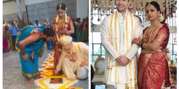 ಹಾಸನ: ಶಿಲ್ಪಕಲೆಗಳ ತವರೂರಲ್ಲಿ ಒಂದು ವಿಶೇಷ ಮುದುವೆ ನಡೆದಿದೆ. ಇಂಗ್ಲೆಂಡ್ ಮೂಲದ ಯುವಕನನ್ನು ವರಿಸಿದ ಬೇಲೂರಿನ ಯುವತಿಯು ಭಾರತೀಯ, ಹಿಂದೂ ಸಂಪ್ರದಾಯದಂತೆ ಅದ್ಧೂರಿಯಾಗಿ ಮದುವೆಯಾಗಿದ್ದಾರೆ.