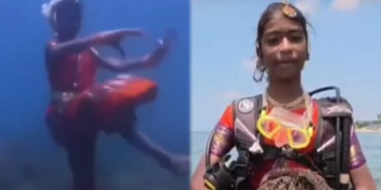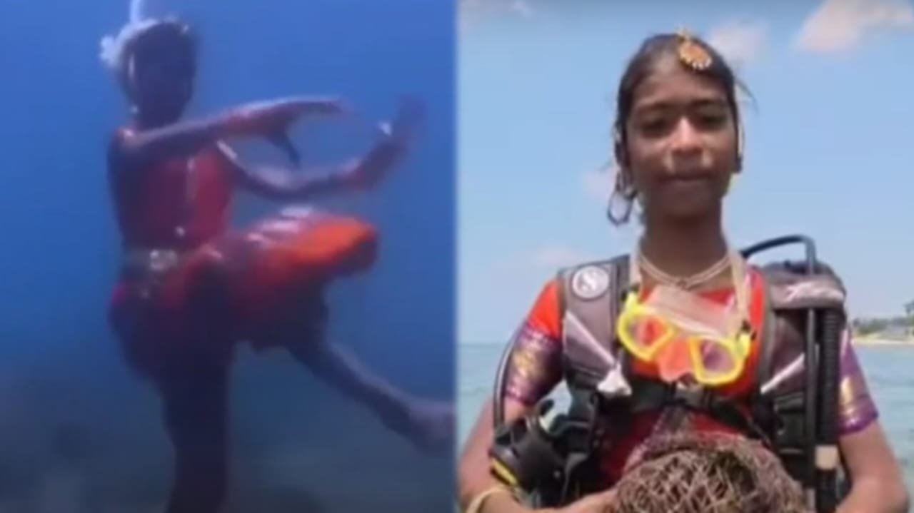 ಪುದುಚೇರಿ : ಪುದುಚೇರಿಯ 14 ವರ್ಷದ ಬಾಲಕಿಯೊಬ್ಬಳು 20 ಅಡಿ ಸಮುದ್ರದ ಆಳದಲ್ಲಿ ಭರತನಾಟ್ಯ ಮಾಡಿರುವ ವಿಡಿಯೋ ಸೋಶಿಯಲ್ ಮೀಡಿಯಾದಲ್ಲಿ ಭಾರೀ ವೈರಲ್ ಆಗಿದೆ.