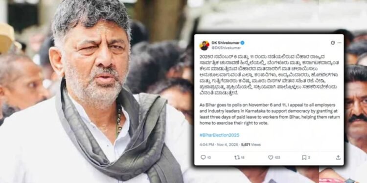 ಈ ಬಗ್ಗೆ ಟ್ವೀಟ್ ಮಾಡಿರುವ ಡಿಸಿಎಂ ಡಿಕೆಶಿ, 2025ರ ನವೆಂಬರ್ 6 ಮತ್ತು 11ರಂದು ನಡೆಯಲಿರುವ ಬಿಹಾರ ರಾಜ್ಯದ ಸಾರ್ವತ್ರಿಕ ಚುನಾವಣೆ ಹಿನ್ನೆಲೆಯಲ್ಲಿ, ಬೆಂಗಳೂರು ಮತ್ತು ಕರ್ನಾಟಕದಾದ್ಯಂತ ಕೆಲಸ ಮಾಡುತ್ತಿರುವ ಬಿಹಾರದ ಮತದಾರರಿಗೆ ಮತ ಚಲಾಯಿಸಲು ಅನುಕೂಲವಾಗುವಂತೆ ಎಲ್ಲಾ ಕಂಪನಿಗಳು, ಉದ್ಯಮಿದಾರರು, ಹೋಟೆಲ್ಗಳು ಮತ್ತು ಗುತ್ತಿಗೆದಾರರು ಕನಿಷ್ಠ ಮೂರು ದಿನಗಳ ವೇತನ ಸಹಿತ ರಜೆ ನೀಡಬೇಕು. ಈ ಮೂಲಕ ಪ್ರಜಾಪ್ರಭುತ್ವ ಪ್ರಕ್ರಿಯೆಯಲ್ಲಿ ಸಕ್ರಿಯವಾಗಿ ಪಾಲ್ಗೊಳ್ಳಲು ಸಹಕರಿಸಬೇಕೆಂದು ವಿನಂತಿ ಮಾಡಿಕೊಂಡಿದ್ದಾರೆ.