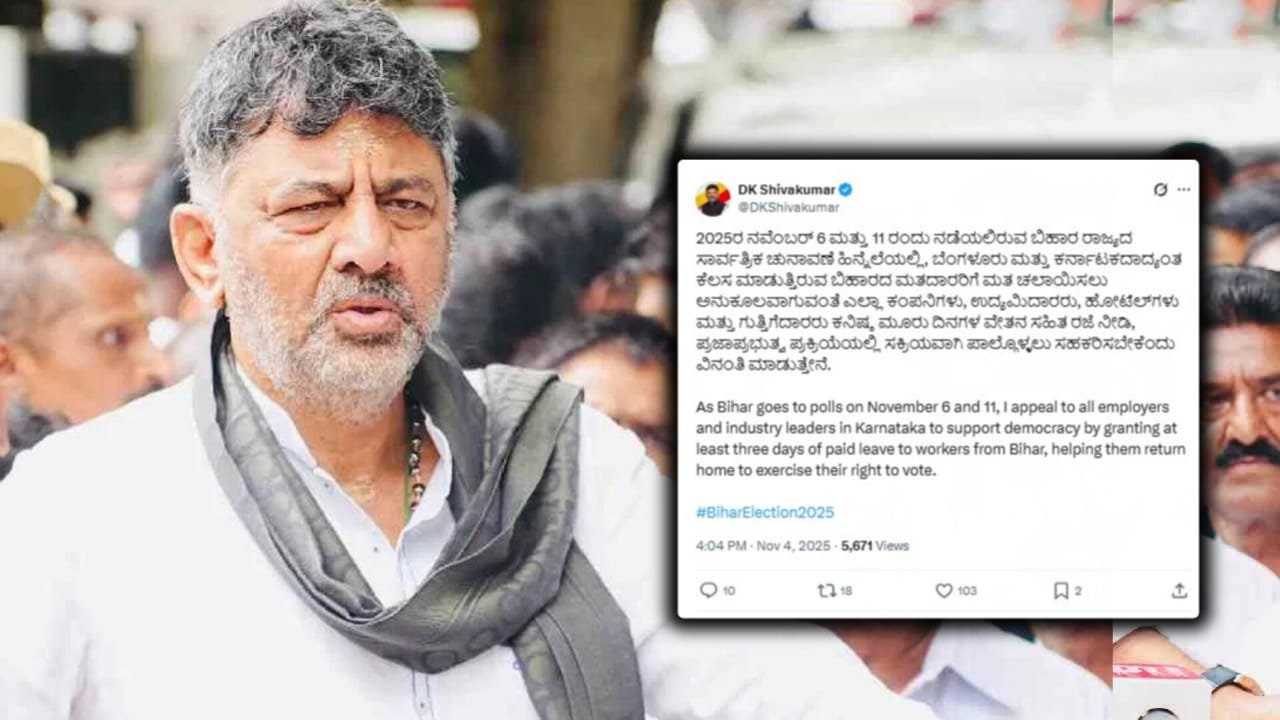ಈ ಬಗ್ಗೆ ಟ್ವೀಟ್ ಮಾಡಿರುವ ಡಿಸಿಎಂ ಡಿಕೆಶಿ, 2025ರ ನವೆಂಬರ್ 6 ಮತ್ತು 11ರಂದು ನಡೆಯಲಿರುವ ಬಿಹಾರ ರಾಜ್ಯದ ಸಾರ್ವತ್ರಿಕ ಚುನಾವಣೆ ಹಿನ್ನೆಲೆಯಲ್ಲಿ, ಬೆಂಗಳೂರು ಮತ್ತು ಕರ್ನಾಟಕದಾದ್ಯಂತ ಕೆಲಸ ಮಾಡುತ್ತಿರುವ ಬಿಹಾರದ ಮತದಾರರಿಗೆ ಮತ ಚಲಾಯಿಸಲು ಅನುಕೂಲವಾಗುವಂತೆ ಎಲ್ಲಾ ಕಂಪನಿಗಳು, ಉದ್ಯಮಿದಾರರು, ಹೋಟೆಲ್ಗಳು ಮತ್ತು ಗುತ್ತಿಗೆದಾರರು ಕನಿಷ್ಠ ಮೂರು ದಿನಗಳ ವೇತನ ಸಹಿತ ರಜೆ ನೀಡಬೇಕು. ಈ ಮೂಲಕ ಪ್ರಜಾಪ್ರಭುತ್ವ ಪ್ರಕ್ರಿಯೆಯಲ್ಲಿ ಸಕ್ರಿಯವಾಗಿ ಪಾಲ್ಗೊಳ್ಳಲು ಸಹಕರಿಸಬೇಕೆಂದು ವಿನಂತಿ ಮಾಡಿಕೊಂಡಿದ್ದಾರೆ.