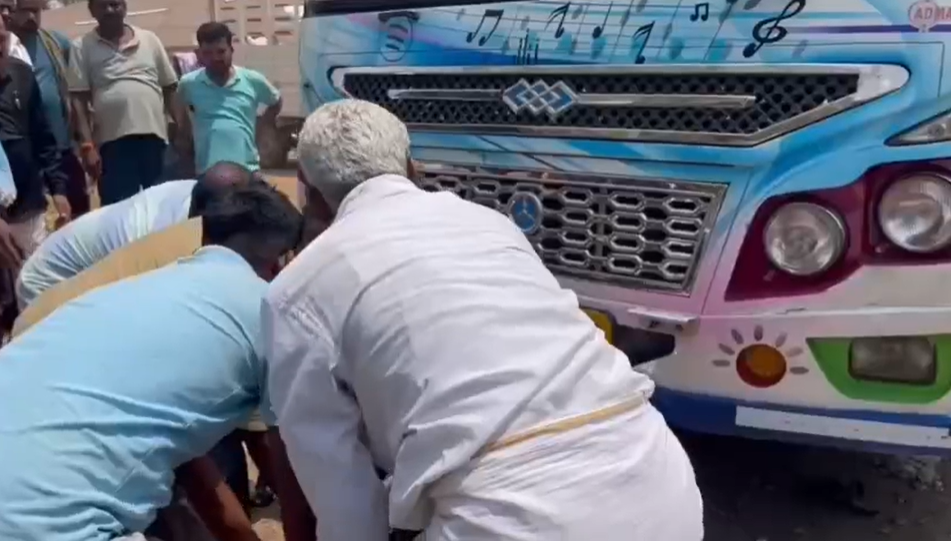 ಶಿರಾ ತಾಲೂಕಿನ ಮದಲೂರು ಗ್ರಾಮದಲ್ಲಿ ಈ ಘಟನೆ ನಡೆದಿದ್ದು, ಅಗಳಿಯಿಂದ ಶಿರಾಗೆ ಬರುತ್ತಿದ್ದ ಖಾಸಗಿ ಬಸ್ ಚಾಲಕನ ಎಡವಟ್ಟಿನಿಂದ ಬೈಕ್ಗೆ ಡಿಕ್ಕಿ ಹೊಡೆದಿದೆ. ಡಿಕ್ಕಿಯ ಪರಿಣಾಮ ಬೈಕ್ ಬಸ್ ಕೆಳಗೆ ನುಗ್ಗಿದರೂ, ಸವಾರರು ಪ್ರಾಣಾಪಾಯದಿಂದ ಪಾರಾಗಿದ್ದಾರೆ.