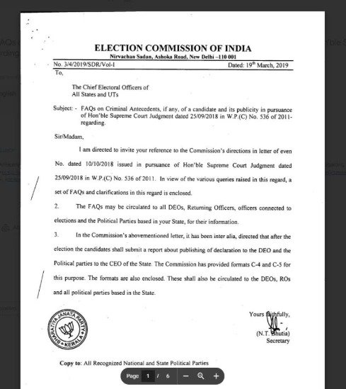 ಈ ವಿವಾದದ ಕುರಿತು ಸ್ಪಷ್ಟನೆ ನೀಡಿರುವ ಕೇರಳ ಮುಖ್ಯ ಚುನಾವಣಾಧಿಕಾರಿ (CEO), ಅಭ್ಯರ್ಥಿಗಳ ಕ್ರಿಮಿನಲ್ ಹಿನ್ನೆಲೆ ಪ್ರಕಟಿಸುವ ಕುರಿತು ಬಿಜೆಪಿ ಇತ್ತೀಚೆಗೆ ಆಯೋಗದಿಂದ ಸ್ಪಷ್ಟನೆ ಕೇಳಿತ್ತು. ಈ ವೇಳೆ ಬಿಜೆಪಿ ಸಲ್ಲಿಸಿದ್ದ 2019ರ ದಾಖಲೆಯ ಫೋಟೋಕಾಪಿಯಲ್ಲಿ ಈಗಾಗಲೇ ಪಕ್ಷದ ಸೀಲು ಇತ್ತು. ಆಫೀಸ್ ಸಿಬ್ಬಂದಿ ಗಮನಿಸದೆ ಅದೇ ಪತ್ರವನ್ನು ಸ್ಕ್ಯಾನ್ ಮಾಡಿ ಇತರ ರಾಜಕೀಯ ಪಕ್ಷಗಳಿಗೆ ರವಾನಿಸಿದ್ದಾರೆ. ಇದು ಕೇವಲ ಒಂದು “ಕ್ಲೆರಿಕಲ್ ಎಡವಟ್ಟು” ಎಂದು ಆಯೋಗ ಸಮರ್ಥಿಸಿಕೊಂಡಿದೆ.