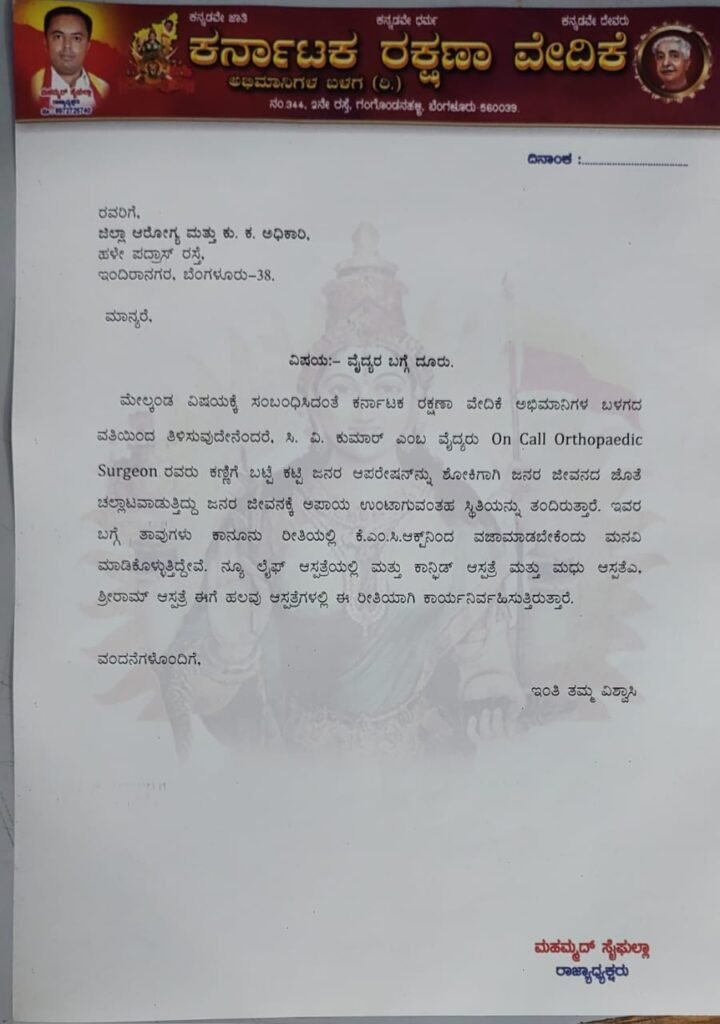 ದೂರಿನ ಸಾರಾಂಶ ಹೀಗಿದೆ : ಸಿ.ವಿ. ಕುಮಾರ್ ಎಂಬ ವೈದ್ಯರು On Call Orthopaedic Surgeonರವರು ಕಣ್ಣಿಗೆ ಬಟ್ಟೆ ಕಟ್ಟಿ ಜನರ ಆಪರೇಷನ್ನ್ನು ಶೋಕಿಗಾಗಿ ಜನರ ಜೀವನದ ಜೊತೆ ಚಲ್ಲಾಟವಾಡುತ್ತಿದ್ದು, ಜನರ ಜೀವನಕ್ಕೆ ಅಪಾಯ ಉಂಟಾಗುವಂತಹ ಸ್ಥಿತಿಯನ್ನು ತಂದಿರುತ್ತಾರೆ. ಇವರ ಬಗ್ಗೆ ತಾವುಗಳು ಕಾನೂನು ರೀತಿಯಲ್ಲಿ ಕೆ.ಎಂ.ಸಿ.ಆಕ್ಷನಿಂದ ವಜಾಮಾಡಬೇಕೆಂದು ಮನವಿ ಮಾಡಿಕೊಳ್ಳುತ್ತಿದ್ದೇವೆ. ನ್ಯೂ ಲೈಫ್ ಆಸ್ಪತ್ರೆಯಲ್ಲಿ ಮತ್ತು ಕಾನ್ಸಿಡ್ ಆಸ್ಪತ್ರೆ ಮತ್ತು ಮಧು ಆಸ್ಪತ್ರೆಎ, ಶ್ರೀರಾಮ್ ಆಸ್ಪತ್ರೆ ಈಗೆ ಹಲವು ಆಸ್ಪತ್ರೆಗಳಲ್ಲಿ ಈ ರೀತಿಯಾಗಿ ಕಾರ್ಯನಿರ್ವಹಿಸುತ್ತಿರುತ್ತಾರೆ ಎಂದು ದೂರಿನಲ್ಲಿ ತಿಳಿಸಲಾಗಿದೆ.
