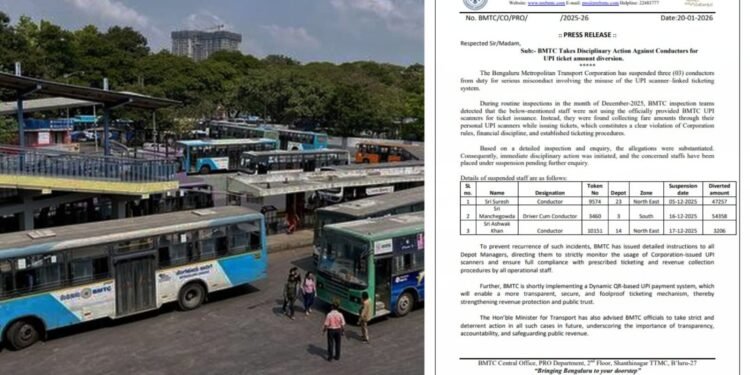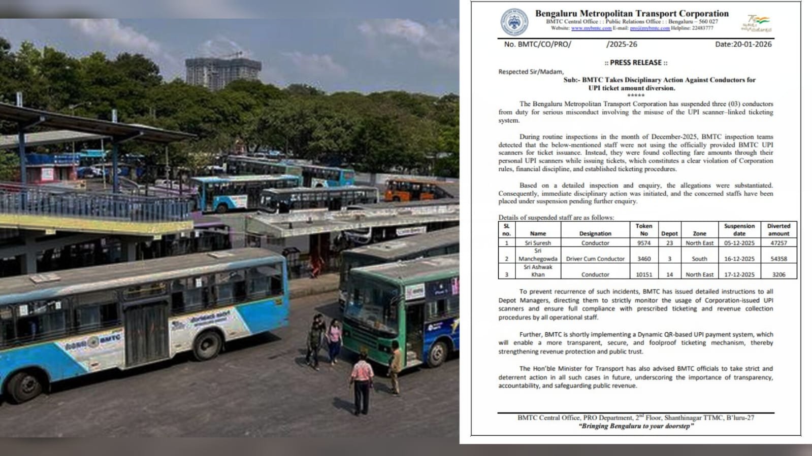 ಬೆಂಗಳೂರು : ಬಿಎಂಟಿಸಿ ನಿರ್ವಾಹಕರು ಯುಪಿಐ ಸ್ಕ್ಯಾನರ್ ದುರ್ಬಳಕೆ ಮಾಡಿಕೊಂಡು ಪ್ರಯಾಣಿಕರಿಂದ ಟಿಕೆಟ್ ಮೊತ್ತವನ್ನು ತಮ್ಮ ವೈಯಕ್ತಿಕ ಖಾತೆಗಳಿಗೆ ವರ್ಗಾಯಿಸಿಕೊಂಡಿರುವ ಅಕ್ರಮವು ಬೆಳಕಿಗೆ ಬಂದಿದ್ದು, ಈ ಹಿನ್ನಲೆಯಲ್ಲಿ ಮೂವರು ಕಂಡಕ್ಟರ್ಗಳನ್ನು ಅಮಾನತು ಮಾಡಲಾಗಿದೆ.