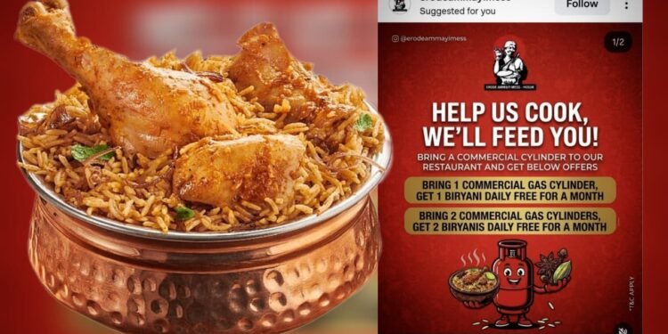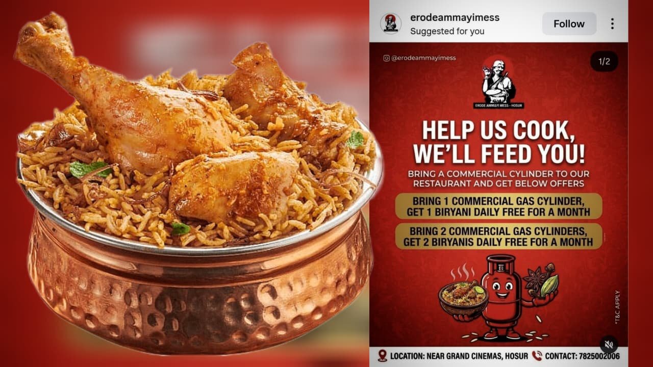 ತಮಿಳುನಾಡಿನ ಹೊಸೂರು ಬಳಿಯ ‘ಈರೋಡ್ ಅಮ್ಮಾಯ್ ಮೆಸ್’ ಈ ಬಿರಿಯಾನಿ ಆಫರ್ ನೀಡಿದೆ. ಗ್ಯಾಸ್ ಕೊರತೆಯಿಂದ ಅಡುಗೆ ಕಾರ್ಯದಲ್ಲಿ ತೊಂದರೆ ಎದುರಿಸುತ್ತಿರುವ ಹೋಟೆಲ್, ಗ್ರಾಹಕರಿಂದಲೇ ಕಮರ್ಷಿಯಲ್ ಗ್ಯಾಸ್ ಸಿಲಿಂಡರ್ ತರಿಸುವ ಮೂಲಕ ಸಮಸ್ಯೆಗೆ ಪರಿಹಾರ ಕಂಡುಕೊಳ್ಳಲು ಮುಂದಾಗಿದೆ.