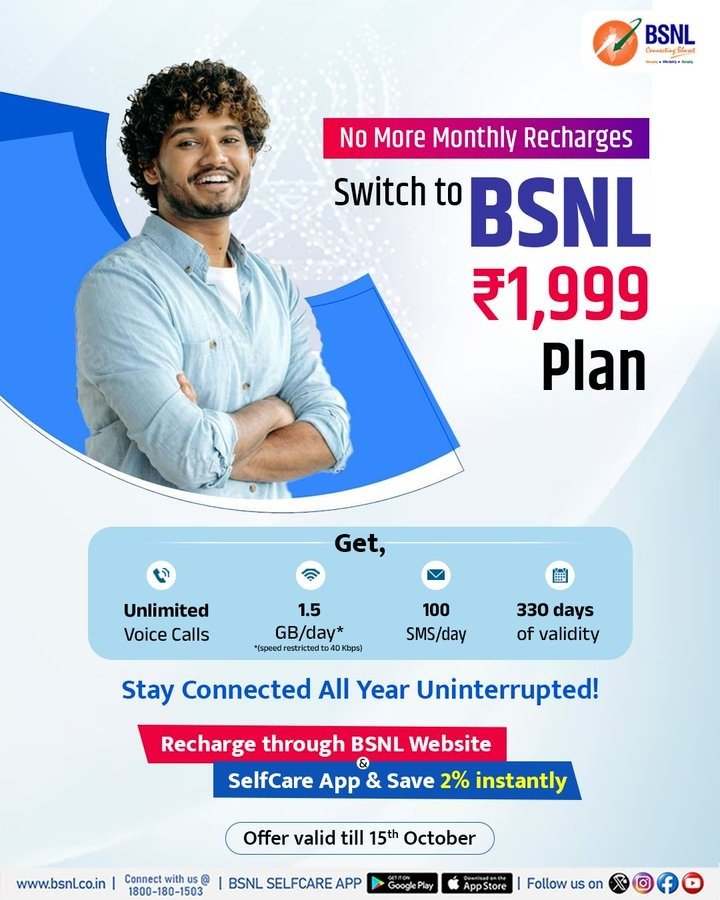 ಹಾಗೆಯೇ, ಒಂದು ವರ್ಷಕ್ಕಾಗಿ ರಿಚಾರ್ಜ್ ಮಾಡಿಸಿದರೂ ಕೆಲ ಆಫರ್ ನೀಡಲಾಗಿದೆ. ಬಿಎಸ್ಸೆನ್ನೆಲ್ ಅಧಿಕೃತ ವೆಬ್ ಸೈಟ್ ಅಥವಾ ಸೆಲ್ಫ್ ಕೇರ್ ಆ್ಯಪ್ ಮೂಲಕ ರಿಚಾರ್ಜ್ ಮಾಡಿದರೆ, ಶೇ.2ರಷ್ಟು ರಿಯಾಯಿತಿ ದೊರೆಯಲಿದೆ. ಈ ಆಫರ್ ಅಕ್ಟೋಬರ್ 15ರವರೆಗೆ ಮಾತ್ರ ಚಾಲ್ತಿಯಲ್ಲಿರಲಿದೆ ಎಂದು ಕಂಪನಿ ತಿಳಿಸಿದೆ.