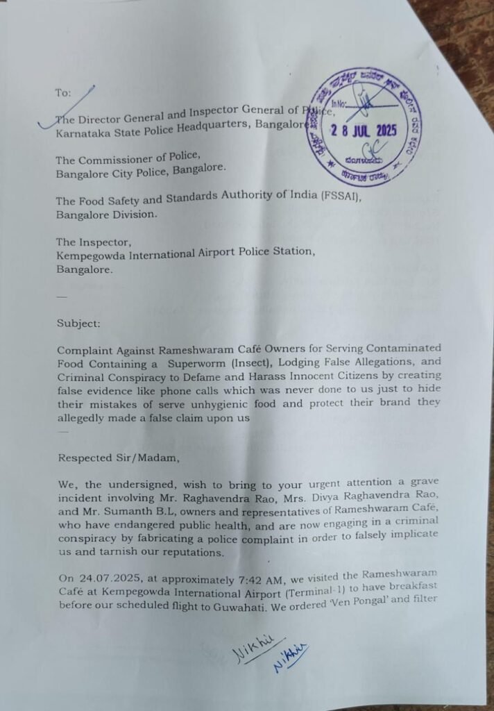 ಬೆಂಗಳೂರು: ಕೆಂಪೇಗೌಡ ಏರ್‌ಪೋರ್ಟ್‌ನ ರಾಮೇಶ್ವರಂ ಕೆಫೆ ಊಟದಲ್ಲಿ ಹುಳ ಪತ್ತೆಯಾಗಿದ್ದ ಪ್ರಕರಣಕ್ಕೆ ಸಂಬಂಧಿಸಿದಂತೆ ಕೆಫೆ ಮಾಲೀಕ ಹಾಗೂ ಮ್ಯಾನೇಜರ್ ವಿರುದ್ಧ ಎಫ್‌ಐಆರ್ ದಾಖಲಾಗಿದೆ.
