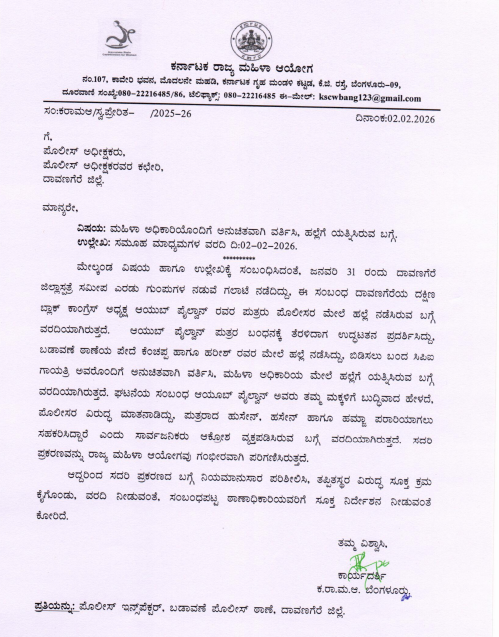 ಬೆಂಗಳೂರು : ದಾವಣಗೆರೆಯಲ್ಲಿ ಪೊಲೀಸ್ ಸಿಬ್ಬಂದಿಯ ಮೇಲಿನ ದೌರ್ಜನ್ಯ ಖಂಡಿಸಿ ಮಹಿಳಾ ಆಯೋಗವು ಕೂಡಲೇ ಕ್ರಮ ಗೊಳ್ಳುವಂತೆ ಆಗ್ರಹಿಸಿ ಪತ್ರ ಬರೆದಿದ್ದಾರೆ.