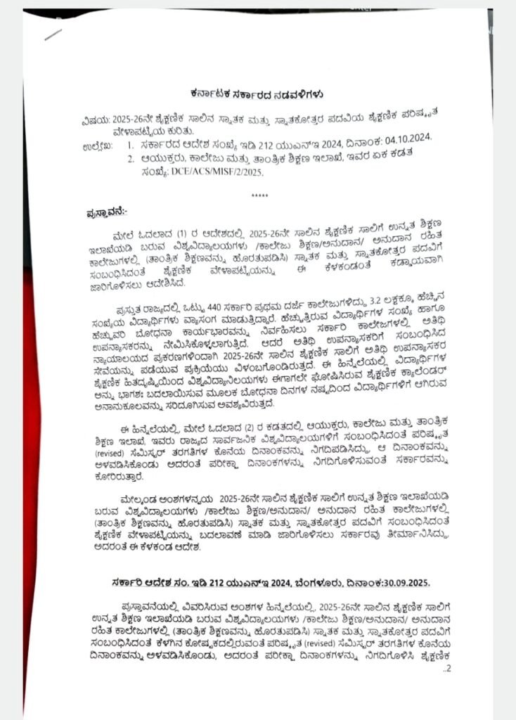 ತಾಂತ್ರಿಕ ಶಿಕ್ಷಣ ಹೊರತು ಪಡಿಸಿ ಉಳಿದೆಲ್ಲಾ ಪದವಿ ಕಾಲೇಜುಗಳ ವೇಳಾಪಟ್ಟಿ ಬದಲಾವಣೆ ಮಾಡಲಾಗಿದೆ. ಪ್ರತಿಯೊಂದು ವಿಶ್ವವಿದ್ಯಾಲಯಕ್ಕೂ ಸೆಮಿಸ್ಟರ್ನ ಆರಂಭ ದಿನಾಂಕ ಮತ್ತು ಕೊನೆಯ ದಿನಾಂಕವನ್ನು ನಿಗದಿ ಮಾಡಲಾಗಿದ್ದು, ಮದ್ಯಂತರ ರಜಾ ಅವಧಿಯನ್ನು ಕಡಿತಗೊಳಿಸಿ ಮುಂದಿನ ಸೆಮಿಸ್ಟರ್ ಆರಂಭಿಸಲು ಸೂಚನೆ ನೀಡಲಾಗಿದೆ. ಪರಿಷ್ಕೃತ ವೇಳಾಪಟ್ಟಿಯನ್ನು ಕಡ್ಡಾಯವಾಗಿ ಅಳವಡಿಸುವಂತೆ ಸರ್ಕಾರ ಆದೇಶ ಮಾಡಿದೆ.