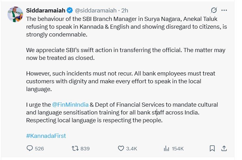ಕನ್ನಡ ಮತ್ತು ಇಂಗ್ಲಿಷ್ ನಲ್ಲಿ ಮಾತನಾಡಲು ನಿರಾಕರಿಸಿ ನಾಗರಿಕರನ್ನು ಕಡೆಗಣಿಸಿರುವ ಆನೇಕಲ್ ತಾಲೂಕಿನ ಸೂರ್ಯಸಿಟಿಯ ಎಸ್ ಬಿಐ ಶಾಖಾ ವ್ಯವಸ್ಥಾಪಕರ ವರ್ತನೆ ತೀವ್ರ ಖಂಡನೀಯ ಎಂದು ಸಿದ್ದರಾಮಯ್ಯ ಎಕ್ಸ್ ಖಾತೆಯಲ್ಲಿ ಪೋಸ್ಟ್ ಮಾಡಿದ್ದಾರೆ.