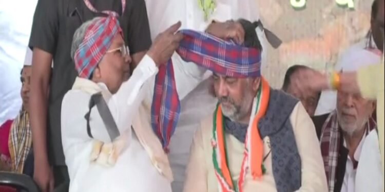 ಬೆಂಗಳೂರು : ಮನರೇಗಾ ಹೆಸರು ಬದಲಿಸಿದ ಕೇಂದ್ರ ಬಿಜೆಪಿ ಸರ್ಕಾರದ ವಿರುದ್ಧ ಫ್ರೀಡಂ ಪಾರ್ಕ್ನಲ್ಲಿ ಕಾಂಗ್ರೆಸ್ ನಡೆಸುತ್ತಿರುವ ಪ್ರತಿಭಟನೆ ವೇಳೆ ಡಿಸಿಎಂ ಡಿ.ಕೆ ಶಿವಕುಮಾರ್ ತಲೆಗೆ ಸಿಎಂ ಸಿದ್ದರಾಮಯ್ಯ ಅವರು ಟವೆಲ್ನಲ್ಲಿ ಪೇಟ ಸುತ್ತಿದ್ದಾರೆ.