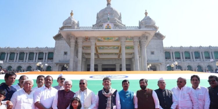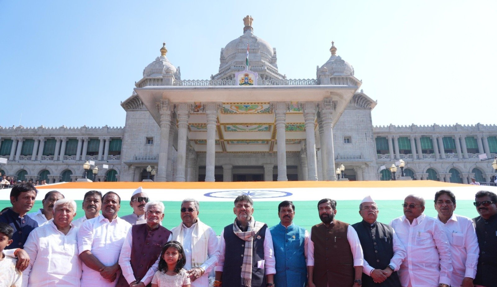 ಬೆಳಗಾವಿ : ಸುವರ್ಣಸೌಧದ ಭವ್ಯ ಮೆಟ್ಟಿಲುಗಳ ಮೇಲೆ ಮುಖ್ಯಮಂತ್ರಿ ಸಿದ್ದರಾಮಯ್ಯ ಅವರಿಂದು (ಡಿ.9) ವಿಶ್ವದಲ್ಲೇ ಎರಡನೇ ಅತಿದೊಡ್ಡ ಖಾದಿ ರಾಷ್ಟ್ರೀಯ ಧ್ವಜವನ್ನು ಅನಾವರಣಗೊಳಿಸಿದರು.