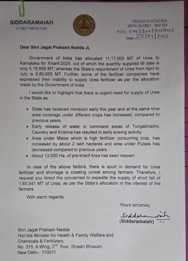 ಬೆಂಗಳೂರು: ರಾಜ್ಯದಲ್ಲಿ ಉಂಟಾಗುತ್ತಿರುವ ಯೂರಿಯಾ ಕೊರತೆ ಹಿನ್ನಲೆಯಲ್ಲಿ ರಾಜ್ಯಕ್ಕೆ ಕೊಡಬೇಕಾದ ಯೂರಿಯಾವನ್ನು ಕೂಡಲೇ ಬಿಡುಗಡೆಗೊಳಿಸುವಂತೆ ಕೇಂದ್ರ ಸಚಿವ ಜೆ.ಪಿ.ನಡ್ಡಾ ಅವರಿಗೆ ಸಿಎಂ ಸಿದ್ದರಾಮಯ್ಯ ಪತ್ರದ ಮೂಲಕ ಆಗ್ರಹಿಸಿದ್ದಾರೆ.
