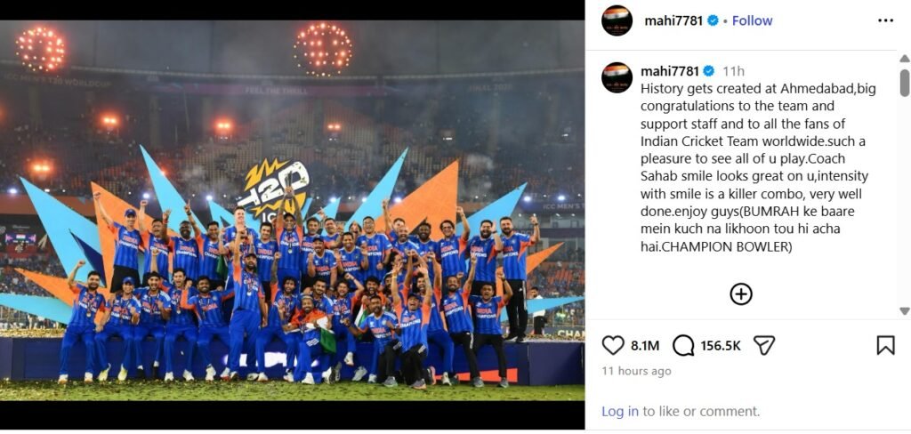 “ಬುಮ್ರಾ ಬಗ್ಗೆ ನಾನು ಏನೂ ಬರೆಯದಿರುವುದೇ ಒಳ್ಳೆಯದು, ಆತ ಒಬ್ಬ ಚಾಂಪಿಯನ್ ಬೌಲರ್” ಎಂದು ಧೋನಿ ಬರೆದುಕೊಂಡಿದ್ದಾರೆ. ಆಧುನಿಕ ಕ್ರಿಕೆಟ್ನ ಶ್ರೇಷ್ಠ ಬೌಲರ್ ಆಗಿರುವ ಬುಮ್ರಾ ಅವರ ಪ್ರದರ್ಶನ ಎಷ್ಟರಮಟ್ಟಿಗೆ ಪ್ರಭಾವಶಾಲಿಯಾಗಿತ್ತು ಎಂದರೆ, ಯಾವುದೇ ವಿಶೇಷಣಗಳು ಅಥವಾ ಹೊಗಳುವಿಕೆಗಳು ಅವರ ಸಾಧನೆಗೆ ಕಡಿಮೆಯೇ ಎನಿಸುತ್ತವೆ. ಇದೇ ಕಾರಣಕ್ಕೆ ಧೋನಿ ಏನನ್ನೂ ಹೇಳದೆ, ಎಲ್ಲವನ್ನೂ ಹೇಳುವ ಮೂಲಕ ಸತತ ಎರಡನೇ ಟಿ20 ವಿಶ್ವಕಪ್ ಗೆಲುವಿನಲ್ಲಿ ಬುಮ್ರಾ ಅವರ ಕೊಡುಗೆಯನ್ನು ಅತ್ಯುನ್ನತ ಮಟ್ಟದಲ್ಲಿ ಗೌರವಿಸಿದ್ದಾರೆ. ಅಲ್ಲದೆ, ಅಹಮದಾಬಾದ್ನಲ್ಲಿ ಹೊಸ ಇತಿಹಾಸ ಸೃಷ್ಟಿಯಾಗಿದೆ, ಇಡೀ ತಂಡಕ್ಕೆ, ಸಹಾಯಕ ಸಿಬ್ಬಂದಿಗೆ ಮತ್ತು ಪ್ರಪಂಚದಾದ್ಯಂತ ಇರುವ ಟೀಮ್ ಇಂಡಿಯಾ ಅಭಿಮಾನಿಗಳಿಗೆ ದೊಡ್ಡ ಅಭಿನಂದನೆಗಳು ಎಂದು ಧೋನಿ ಶುಭಕೋರಿದ್ದಾರೆ.