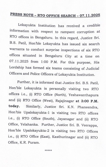 ಭ್ರಷ್ಟಚಾರ ಆರೋಪ | ಬೆಂಗಳೂರಿನ 6 RTO ಕಚೇರಿಗಳ ಮೇಲೆ ಲೋಕಾಯುಕ್ತ ರೇಡ್‌