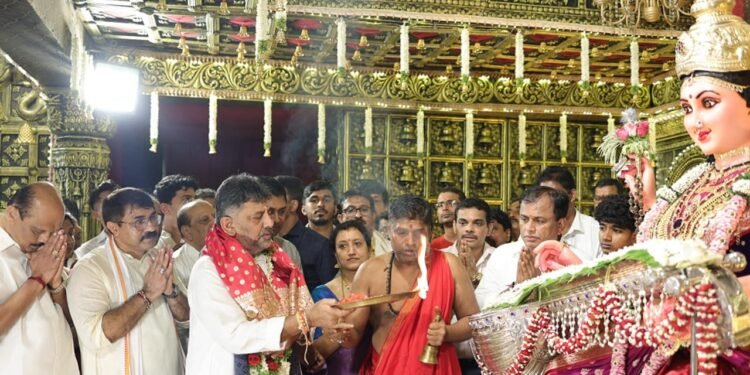 ಮಂಗಳೂರು: ವಿಶ್ವವಿಖ್ಯಾತ ಮಂಗಳೂರು ದಸರಾ ಸಂಭ್ರಮದ ಹಿನ್ನೆಲೆಯಲ್ಲಿ ರಾಜ್ಯದ ಉಪಮುಖ್ಯಮಂತ್ರಿ ಡಿ.ಕೆ.ಶಿವಕುಮಾರ್ ಅವರು ಕುದ್ರೋಳಿ ಶ್ರೀ ಗೋಕರ್ಣನಾಥ ಕ್ಷೇತ್ರಕ್ಕೆ ಭೇಟಿ ನೀಡಿದರು. ಈ ವೇಳೆ ಮಂಗಳೂರು ದಸರಾ ವೈಭವಕ್ಕೆ ಮೆಚ್ಚುಗೆ ವ್ಯಕ್ತಪಡಿಸಿದರು.