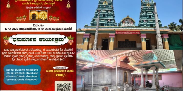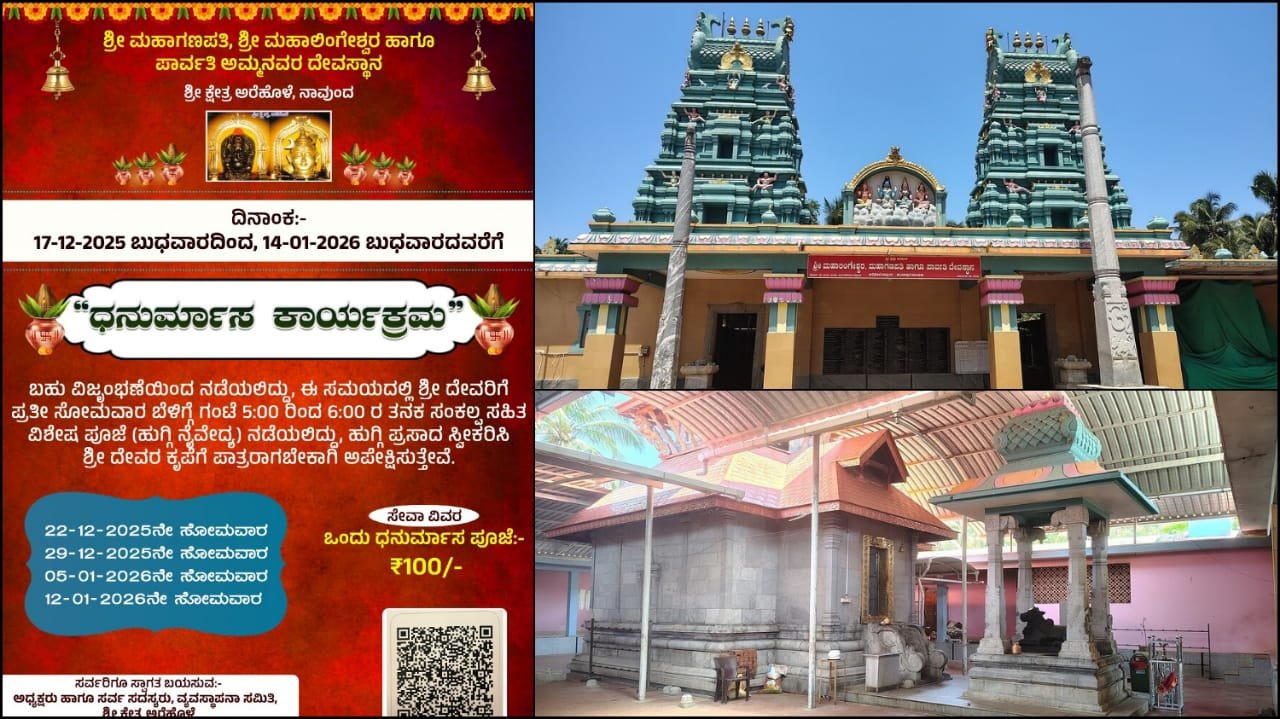ಧನುರ್ಮಾಸ ಹಿನ್ನೆಲೆ ರಾಜ್ಯದ ವಿವಿಧ ದೇವಸ್ಥಾನಗಳಲ್ಲಿ ಭಕ್ತಿ-ಭಾವದಿಂದ ದೇವರಿಗೆ ವಿಶೇಷ ಪೂಜೆ ಪುನಸ್ಕಾರಗಳನ್ನು ಸಲ್ಲಿಸಲಾಗುತ್ತದೆ. ಅದರಂತೆ ಉಡುಪಿ ಜಿಲ್ಲೆಯ ಅರೆಹೊಳೆಯ ಶ್ರೀ ಮಹಾಗಣಪತಿ, ಶ್ರೀ ಮಹಾಲಿಂಗೇಶ್ವರ ಹಾಗೂ ಪಾರ್ವತಿ ಅಮ್ಮನವರ ದೇವಸ್ಥಾನದಲ್ಲಿ ಬಹು ವಿಜೃಂಭಣೆಯಿಂದ ‘ಧನುರ್ಮಾಸ ಕಾರ್ಯಕ್ರಮ’ ನಡೆಯಲಿದೆ. ಈ ಬಗ್ಗೆ ದೇವಸ್ಥಾನದ ಆಡಳಿತ ಮಂಡಳಿ ಪ್ರಕಟಣೆಯಲ್ಲಿ ತಿಳಿಸಿದೆ.