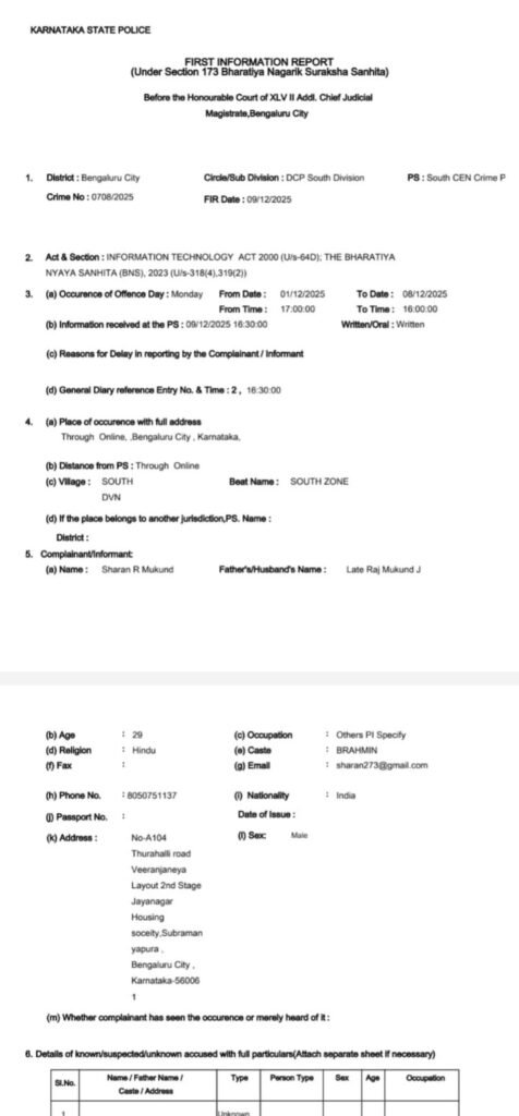 ಸ್ವಲ್ಪ ಹೊತ್ತಿನ ನಂತರ ತುಂಬಾ ಮೃದುವಾಗಿ ಮಾತನಾಡಲು ಶುರು ಮಾಡಿದ್ದಾರೆ, ನಿಮ್ಮ ಮೇಲಿನ ಆರೋಪ ಹೋಗಬೇಕೆಂದರೆ, ನಿಮಗೆ ಸರ್ಟಿಫಿಕೇಟ್ ಆಫ್ ಇನ್ವಸೇನಟ್ ಬೇಕೆಂದರೆ ಸ್ವಲ್ಪ ಹಣ ಪೇ ಮಾಡಬೇಕು. ಅದು ಗವರ್ನಮೆಂಟ್ ಫೀಸ್ ಎಂದು ಹೇಳಿದ್ದಾರೆ. ಈ ತನಿಖೆ ಮುಗಿದ ನಂತರ ವಾಪಾಸ್ ಮಾಡುತ್ತೇವೆ ಎಂದು ಹೇಳಿದ್ದಾರೆ. ಶರಣ್ ಆರ್ ಮುಕುಂದ್ ಅವರು ವಂಚಕರಿಗೆ ಹಂತ ಹಂತವಾಗಿ ಹಣವನ್ನು ವರ್ಗಾವಣೆ ಮಾಡಿದ್ದಾರೆ. ಹೀಗೆ ಒಟ್ಟು 5.53 ಲಕ್ಷ ರೂ.ವರೆಗೆ ಹಣವನ್ನು ವಂಚಕರಿಗೆ ಕಳುಹಿಸಿದ್ದಾರೆ. ಕೊನೆಗೆ ಶರಣ್ ಆರ್ ಮುಕುಂದ್ ಅವರಿಗೆ ಈ ಬಗ್ಗೆ ಅನುಮಾನ ಬಂದು 1930ಗೆ ಕರೆ ಮಾಡಿ ವಿಚಾರ ತಿಳಿಸಿದ್ದಾರೆ. ಇದೀಗ ಈ ಪ್ರಕರಣಕ್ಕೆ ಸಂಬಂಧಿಸಿದಂತೆ ಸೌತ್ ಸಿಇಎನ್ ಠಾಣೆಯಲ್ಲಿ ಪ್ರಕರಣ ದಾಖಲಾಗಿದೆ.