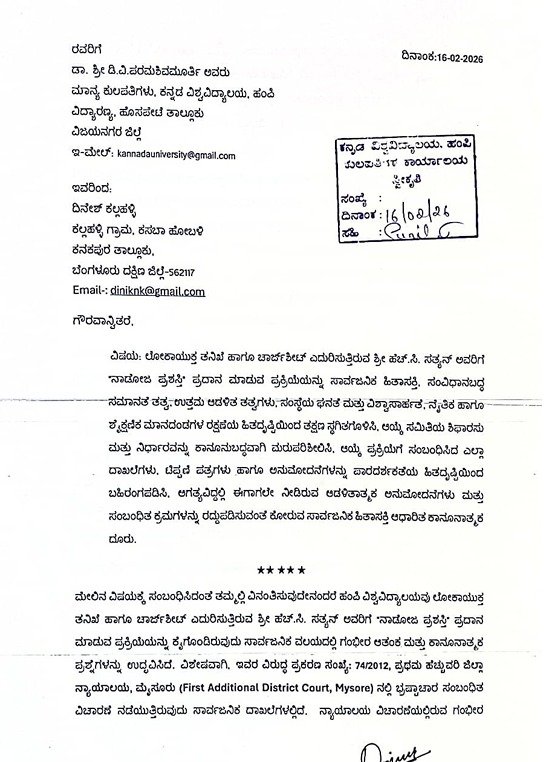 ಹಂಪಿ ವಿಶ್ವವಿದ್ಯಾಲಯವು ಲೋಕಾಯುಕ್ತ ತನಿಖೆ ಹಾಗೂ ಚಾರ್ಜ್‌ ಶೀಟ್ ಎದುರಿಸುತ್ತಿರುವ ಹೆಚ್.ಸಿ. ಸತ್ಯನ್ ಅವರಿಗೆ ‘ನಾಡೋಜ ಪ್ರಶಸ್ತಿ’ ಪ್ರದಾನ ಮಾಡುವ ಪ್ರಕ್ರಿಯೆಯನ್ನು ಕೈಗೊಂಡಿರುವುದು ಸೂಕ್ತವಾಗಿಲ್ಲ. ನಾಡೋಜ ಪ್ರಶಸ್ತಿ ವಿಶ್ವವಿದ್ಯಾಲಯದ ಅತ್ಯುನ್ನತ ಗೌರವಗಳಲ್ಲಿ ಒಂದಾಗಿದ್ದು, ಸಾರ್ವಜನಿಕ ಜೀವನದಲ್ಲಿ ಉನ್ನತ ನೈತಿಕತೆ, ಪ್ರಾಮಾಣಿಕತೆ ಮತ್ತು ಸಮಾಜಮುಖಿ ಮೌಲ್ಯಗಳನ್ನು ಪ್ರತಿಬಿಂಬಿಸುವ ವ್ಯಕ್ತಿಗಳಿಗೆ ಮಾತ್ರ ನೀಡಬೇಕಾದ ಸಮ್ಮಾನವಾಗಿದೆ. ಭ್ರಷ್ಟಾಚಾರ ಸಂಬಂಧಿತ ಗಂಭೀರ ಆರೋಪಗಳ ಹಿನ್ನೆಲೆಯಲ್ಲಿ ಲೋಕಾಯುಕ್ತ ತನಿಖೆ ಮತ್ತು ಚಾರ್ಜ್‌ ಶೀಟ್ ಪ್ರಕ್ರಿಯೆ ಮುಂದುವರಿಯುತ್ತಿರುವ ಸಂದರ್ಭದಲ್ಲಿ ಇಂತಹ ಗೌರವ ಪ್ರದಾನ ಮಾಡುವುದು ಸಂಸ್ಥೆಯ ಘನತೆ, ನಂಬಿಕೆ ಹಾಗೂ ಸಾರ್ವಜನಿಕ ಹಿತಾಸಕ್ತಿಗೆ ವಿರುದ್ಧವಾಗುತ್ತದೆ. ಆದ್ದರಿಂದ ಪ್ರಶಸ್ತಿ ಪ್ರದಾನ ಮರುಪರಿಶೀಲನೆ ಅಗತ್ಯವಾಗಿದೆ ಎಂದು ದಿನೇಶ್ ಕಲ್ಲಹಳ್ಳಿ ತಿಳಿಸಿದ್ದಾರೆ.