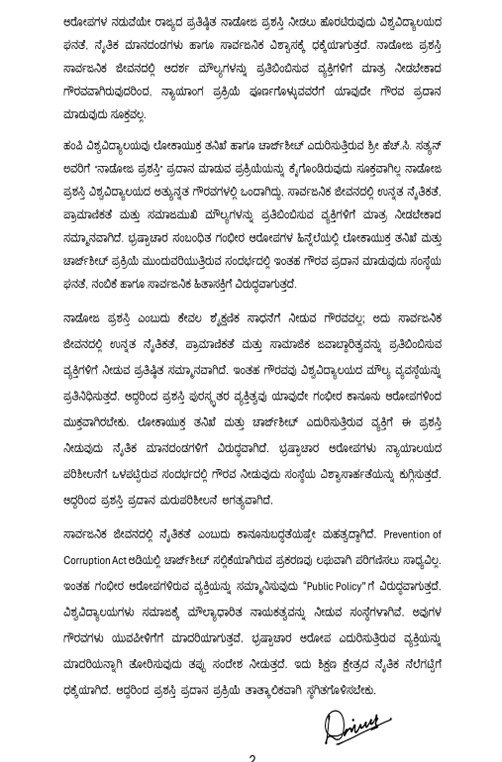 ಸಾರ್ವಜನಿಕ ಜೀವನದಲ್ಲಿ ನೈತಿಕತೆ ಎಂಬುದು ಕಾನೂನುಬದ್ಧತೆಯಷ್ಟೇ ಮಹತ್ವದ್ದಾಗಿದೆ. Prevention of Corruption Act ಅಡಿಯಲ್ಲಿ ಚಾರ್ಜ್‌ ಶೀಟ್ ಸಲ್ಲಿಕೆಯಾಗಿರುವ ಪ್ರಕರಣವು ಲಘುವಾಗಿ ಪರಿಗಣಿಸಲು ಸಾಧ್ಯವಿಲ್ಲ. ಇಂತಹ ಗಂಭೀರ ಆರೋಪಗಳಿರುವ ವ್ಯಕ್ತಿಯನ್ನು ಸಮ್ಮಾನಿಸುವುದು “Public Policy”ಗೆ ವಿರುದ್ಧವಾಗುತ್ತದೆ. ಭ್ರಷ್ಟಾಚಾರ ಆರೋಪ ಎದುರಿಸುತ್ತಿರುವ ವ್ಯಕ್ತಿಯನ್ನು ಮಾದರಿಯನ್ನಾಗಿ ತೋರಿಸುವುದು ತಪ್ಪು ಸಂದೇಶ ನೀಡುತ್ತದೆ. ಇದು ಶಿಕ್ಷಣ ಕ್ಷೇತ್ರದ ನೈತಿಕ ನೆಲೆಗಟ್ಟಿಗೆ ಧಕ್ಕೆಯಾಗಿದೆ. ಹೀಗಾಗಿ ಅಂತಿಮ ನ್ಯಾಯಾಲಯದ ತೀರ್ಪು ಹೊರಬರುವವರೆಗೆ ಯಾವುದೇ ಗೌರವ ನೀಡಬಾರದು, ಪ್ರಶಸ್ತಿ ಪ್ರದಾನ ಪ್ರಕ್ರಿಯೆ ತಾತ್ಕಾಲಿಕವಾಗಿ ಸ್ಥಗಿತಗೊಳಿಸಬೇಕು ದಿನೇಶ್ ಕಲ್ಲಹಳ್ಳಿ ಅವರು ಪತ್ರದಲ್ಲಿ ಉಲ್ಲೇಖಿಸಿದ್ದಾರೆ.