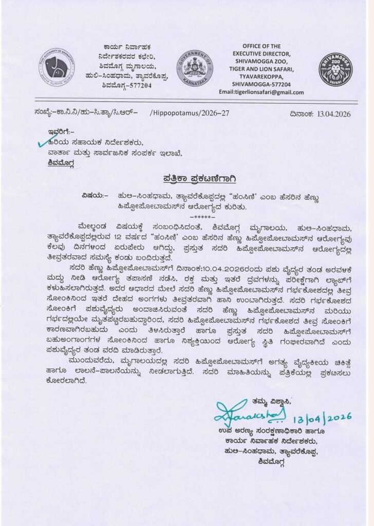 ಶಿವಮೊಗ್ಗ: ಡಾ. ಸಮೀಕ್ಷಾ ಸಾವಿಗೆ ಕಾರಣವಾಗಿದ್ದ ತ್ಯಾವರೆಕೊಪ್ಪ ಹುಲಿ-ಸಿಂಹಧಾಮದಲ್ಲಿರುವ ಹಂಸಿಣಿ ಎಂಬ ನೀರಾನೆ ಆರೋಗ್ಯ ಸ್ಥಿತಿ ಇದೀಗ ಗಂಭೀರವಾಗಿದೆ ಎಂದು ಮೃಗಾಲಯದ ಅಧಿಕಾರಿಗಳು ತಿಳಿಸಿದ್ದಾರೆ.