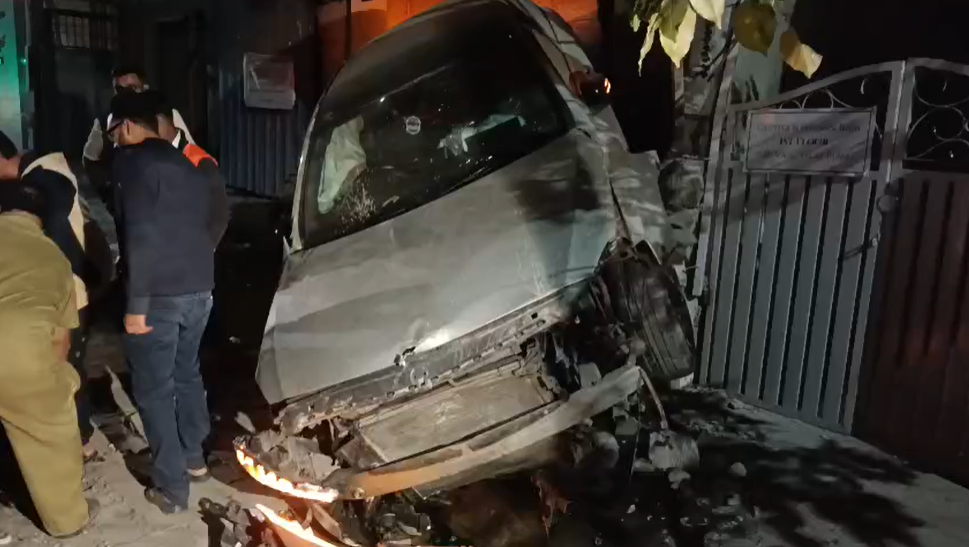 ಮರ್ಸಿಡಿಸ್ ಬೆನ್ಸ್ ಕಾರೊಂದು ಅತೀ ವೇಗವಾಗಿ ಬಂದಿದ್ದು, ನಿಯಂತ್ರಣ ಸಿಗದೇ ಕಾಂಪೌಂಡ್ಗೆ ಗುದ್ದಿದ್ದಾನೆ ಅದೃಷ್ಟಾವಶಾತ್ ಜೀವಾಪಾಯದಿಂದ ಪಾರಾಗಿದ್ದಾನೆ. ಈ ಕಾರು ಛತ್ತೀಸ್ ಘಡ್ ರಿಜಿಸ್ಟ್ರೇಷನ್ ನೊಂದಾಣಿ ಕಾರಾಗಿತ್ತು.