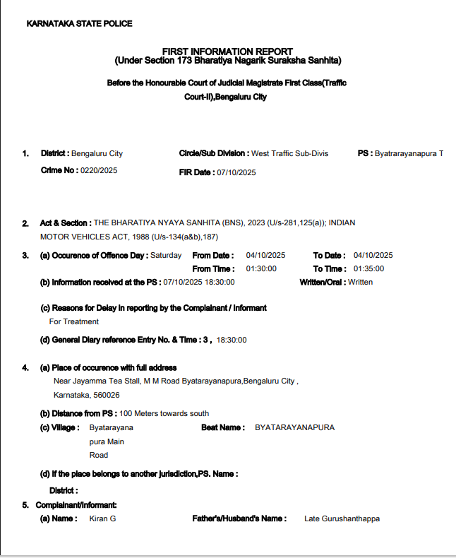 ದಿವ್ಯಾ ಸುರೇಶ್ ಗಾಯಾಳುಗಳನ್ನು ನೋಡದೇ ಕಾರ್ ನಿಲ್ಲಿಸದೇ ಕೂಡಲೇ ಪರಾರಿಯಾಗಿದ್ದಾರೆ ಎಂದು ಗಾಯಾಳು ಸಂಬಧಿ ಕಿರಣ ಎಂಬಾತ ಅ.7ರಂದು ಬ್ಯಾಟರಾಯನಪುರ ಸಂಚಾರಿ ಠಾಣೆಗೆ ದೂರು ನೀಡಿದ್ದಾರೆ.