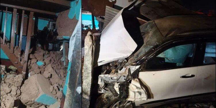 ಅತೀ ವೇಗದಲ್ಲಿ ಚಾಲಕ ಕಾರಿನ ನಿಯಂತ್ರಣ ಕಳೆದುಕೊಂಡಿದ್ದಾನೆ. ಇದರಿಂದ ಕಾಂಪೌಂಡ್ ಹಾರಿ ಮನೆಗೆ ಕಾರು ಗುದ್ದಿದೆ. ಪರಿಣಾಮ ಮನೆಯ ಚಾವಣಿ ಕುಸಿದಿದೆ. ಅದೃಷ್ಟವಶಾತ್ ಮನೆಯಲ್ಲಿ ಯಾರೂ ಇಲ್ಲದ ಕಾರಣ ಅನಾಹುತ ತಪ್ಪಿದೆ. ಘಟನೆ ಬಳಿಕ ಸ್ಥಳೀಯರು ಆಗಮಿಸಿ, ಗಾಯಾಳುಗಳನ್ನು ರಕ್ಷಿಸಿದ್ದಾರೆ.