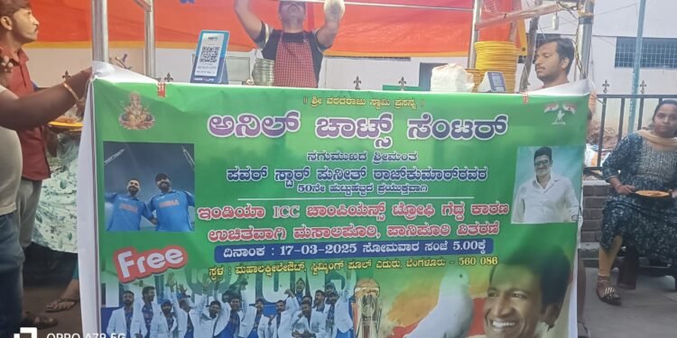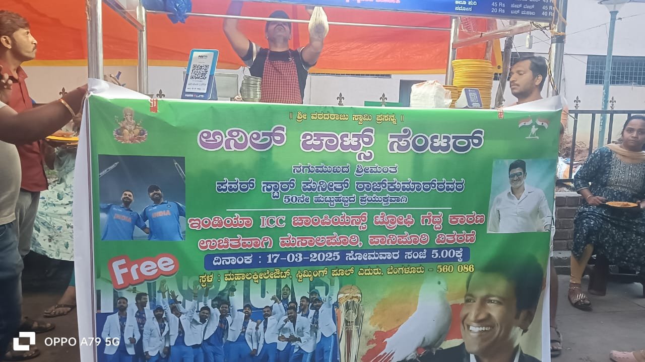 ಬೆಂಗಳೂರು: ಕರ್ನಾಟಕ ರತ್ನ, ದಿವಂಗತ ಪುನೀತ್ ರಾಜಕುಮಾರ್ ಅವರ 50ನೇ ಹುಟ್ಟು ಹಬ್ಬದ ಅಂಗವಾಗಿ ಹಾಗೂ ಭಾರತ ತಂಡ ಐಸಿಸಿ ಚಾಂಪಿಯನ್ಸ್ ಟ್ರೋಫಿ ಗೆದ್ದ ಹಿನ್ನೆಲೆಯಲ್ಲಿ ಪುನೀತ್ ಅಭಿಮಾನಿಯೊಬ್ಬರು ಉಚಿತ ಚಾಟ್ಸ್ ವಿತರಿಸುವುದಾಗಿ ಘೋಷಿಸಿದ್ದಾರೆ.