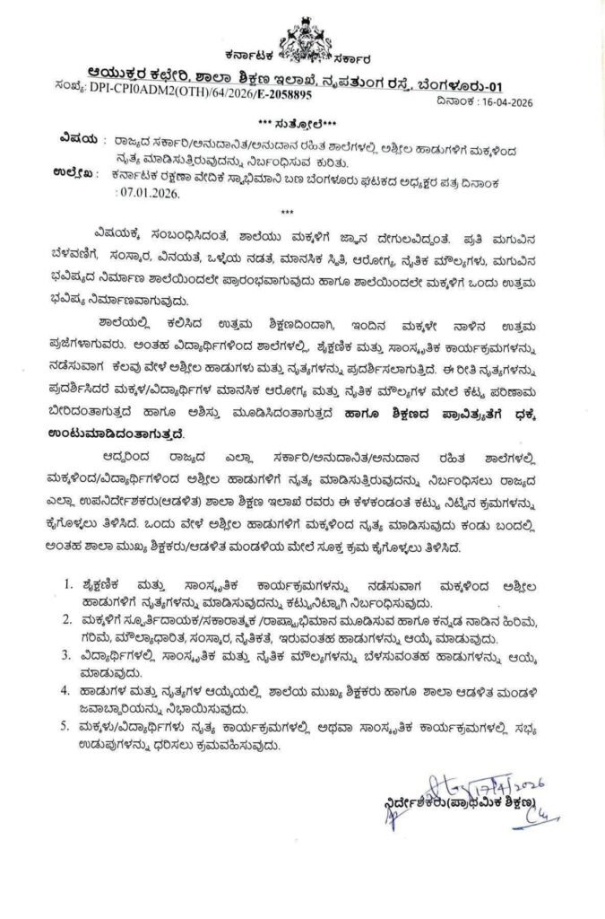 ಶೈಕ್ಷಣಿಕ ಮತ್ತು ಸಾಂಸ್ಕೃತಿಕ ಕಾರ್ಯಕ್ರಮಗಳನ್ನು ನಡೆಸುವಾಗ ಮಕ್ಕಳಿಂದ ಅಶ್ಲೀಲ ಹಾಡುಗಳಿಗೆ ನೃತ್ಯಗಳನ್ನು ಮಾಡಿಸುವುದನ್ನು ಕಟ್ಟುನಿಟ್ಟಾಗಿ ನಿರ್ಬಂಧಿಸಬೇಕು. ಒಂದು ವೇಳೆ ಅಶ್ಲೀಲ ಹಾಡುಗಳಿಗೆ ಮಕ್ಕಳಿಂದ ನೃತ್ಯ ಮಾಡಿಸುವುದು ಕಂಡು ಬಂದಲ್ಲಿ ಅಂತಹ ಶಾಲಾ ಮುಖ್ಯ ಶಿಕ್ಷಕರು, ಆಡಳಿತ ಮಂಡಳಿಯ ಮೇಲೆ ಸೂಕ್ತ ಕ್ರಮ ಕೈಗೊಳ್ಳಲಾಗುತ್ತದೆ ಎಂದು ಆದೇಶದಲ್ಲಿ ಎಚ್ಚರಿಕೆ ನೀಡಲಾಗಿದೆ.