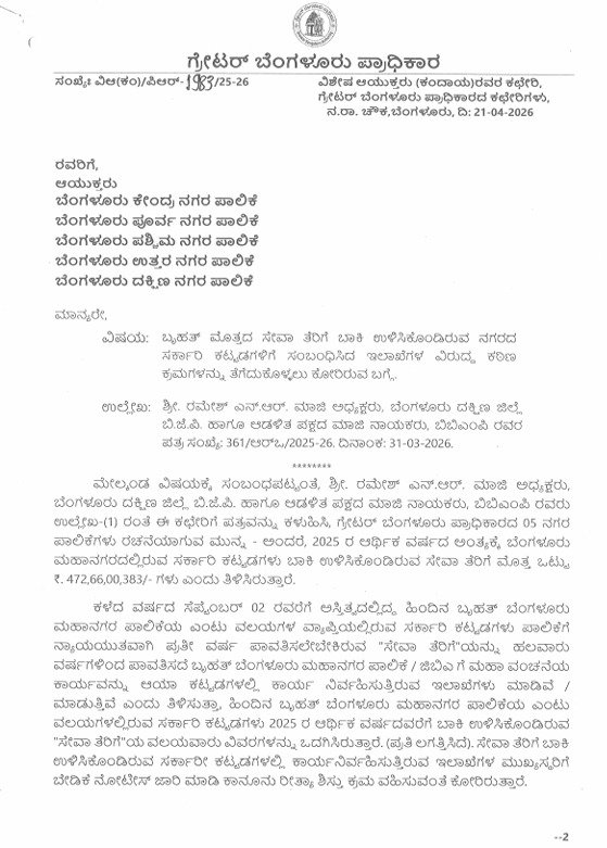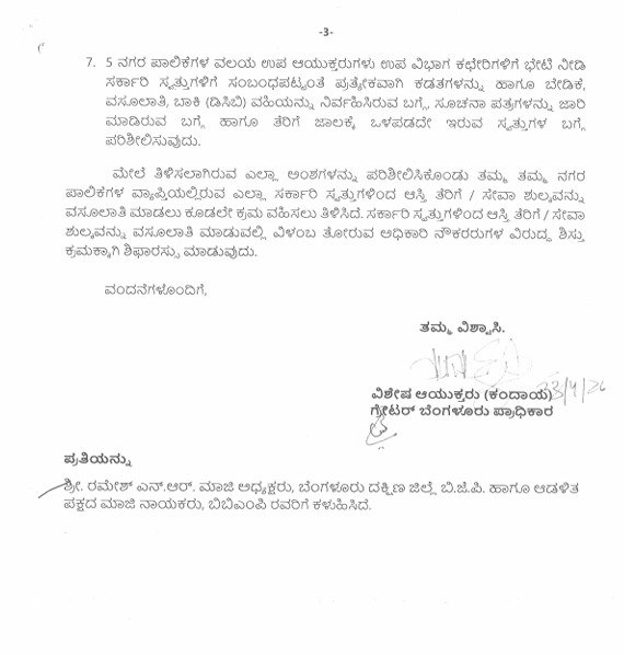 ಸಣ್ಣ ಮೊತ್ತದ ಆಸ್ತಿ ತೆರಿಗೆ ಪಾವತಿಸದ ಮಧ್ಯಮ ಮತ್ತು ಕೆಳ ಮಧ್ಯಮ ವರ್ಗದ ಜನರ ಆಸ್ತಿಗಳನ್ನು ಹರಾಜು ಹಾಕುವುದಕ್ಕೂ ಮೊದಲು 550 ಕೋಟಿಗಳಷ್ಟು ಬೃಹತ್ ಮೊತ್ತದ ಸೇವಾ ತೆರಿಗೆಗಳನ್ನು ಬಾಕಿ ಉಳಿಸಿಕೊಂಡಿರುವ ವಿಧಾನಸೌಧ, ವಿಕಾಸಸೌಧ, ರಾಜಭವನ, ಕುಮಾರಕೃಪಾ ಅತಿಥಿ ಗೃಹ ಸೇರಿದಂತೆ ಎಲ್ಲಾ ಸರ್ಕಾರಿ ಕಟ್ಟಡಗಳ ವಿರುದ್ಧ ಕ್ರಮ ತೆಗೆದುಕೊಂಡು ಒಂದು ದಿನದ ಮಟ್ಟಿಗಾದರೂ ಬೀಗ ಜಡಿಯುವ ಕೆಲಸವನ್ನು ಮಾಡಿ ಎಂದು ದಾಖಲೆಗಳ ಸಮೇತ ಬಿಜೆಪಿ ಮುಖಂಡ ಎನ್.ಆರ್ ರಮೇಶ್ ದೂರು ನೀಡಿದ್ದರು.